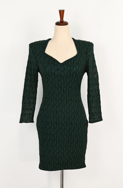 Vintage 80s Dark Green Geometric NIKI PETITES Padded Long Sleeve Bodycon Mini Dress - 12
