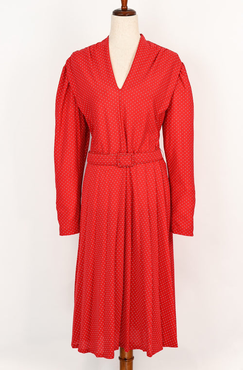 Vintage 80s Red & White Polka-dot JOAN CURTIS Long Sleeve Belted Midi Dress