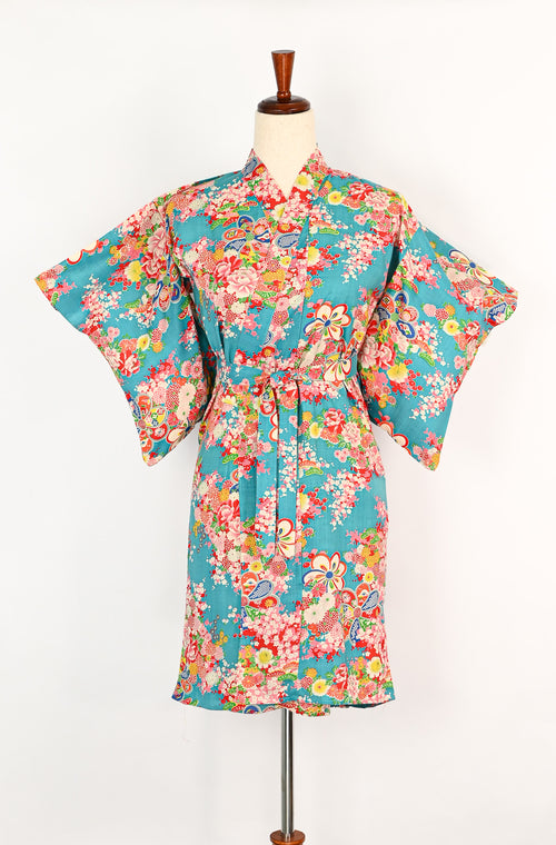 Vintage 40s/50s Turquoise & Pink Floral Komon Kimono w/ Waist Tie