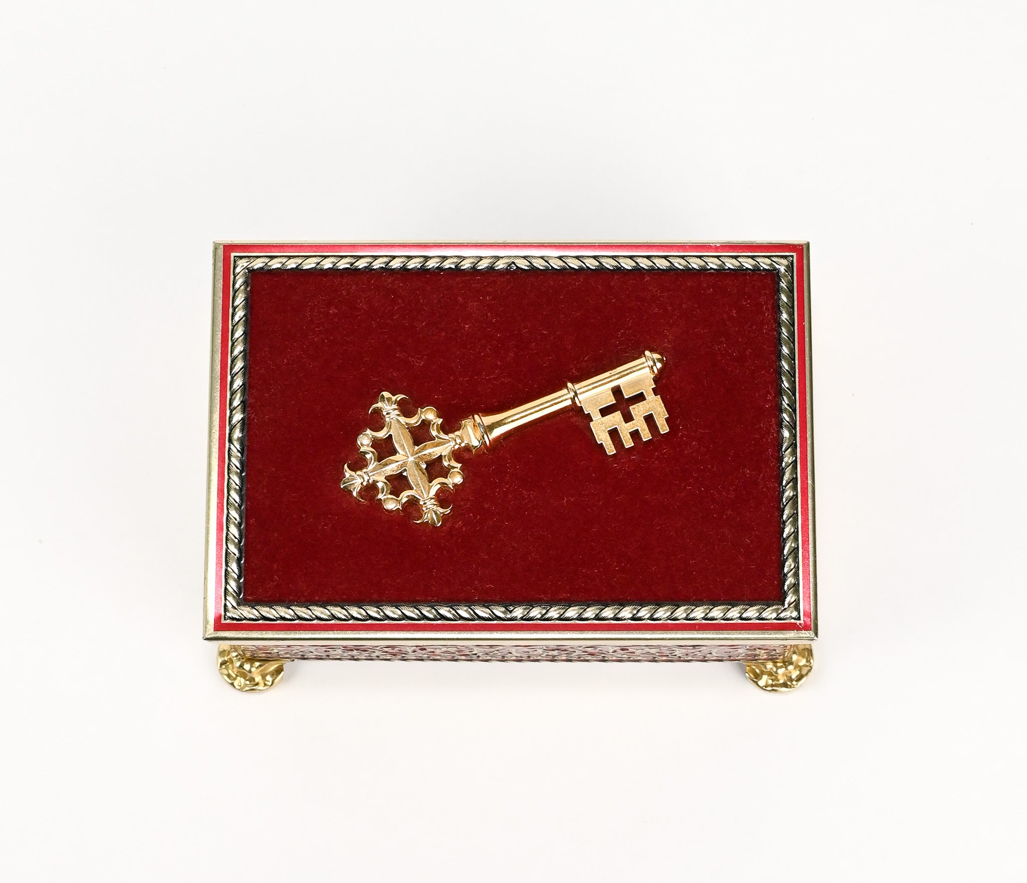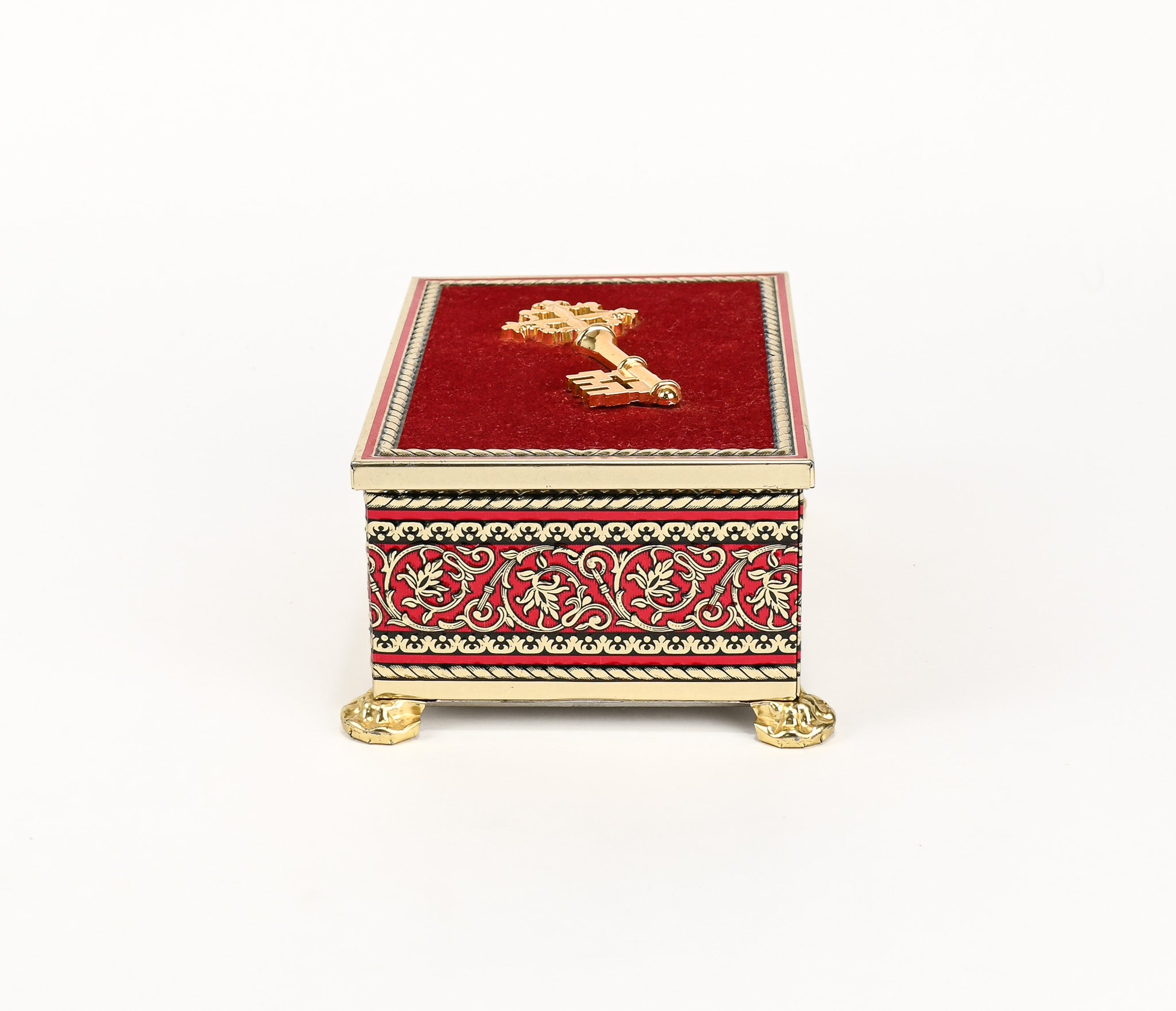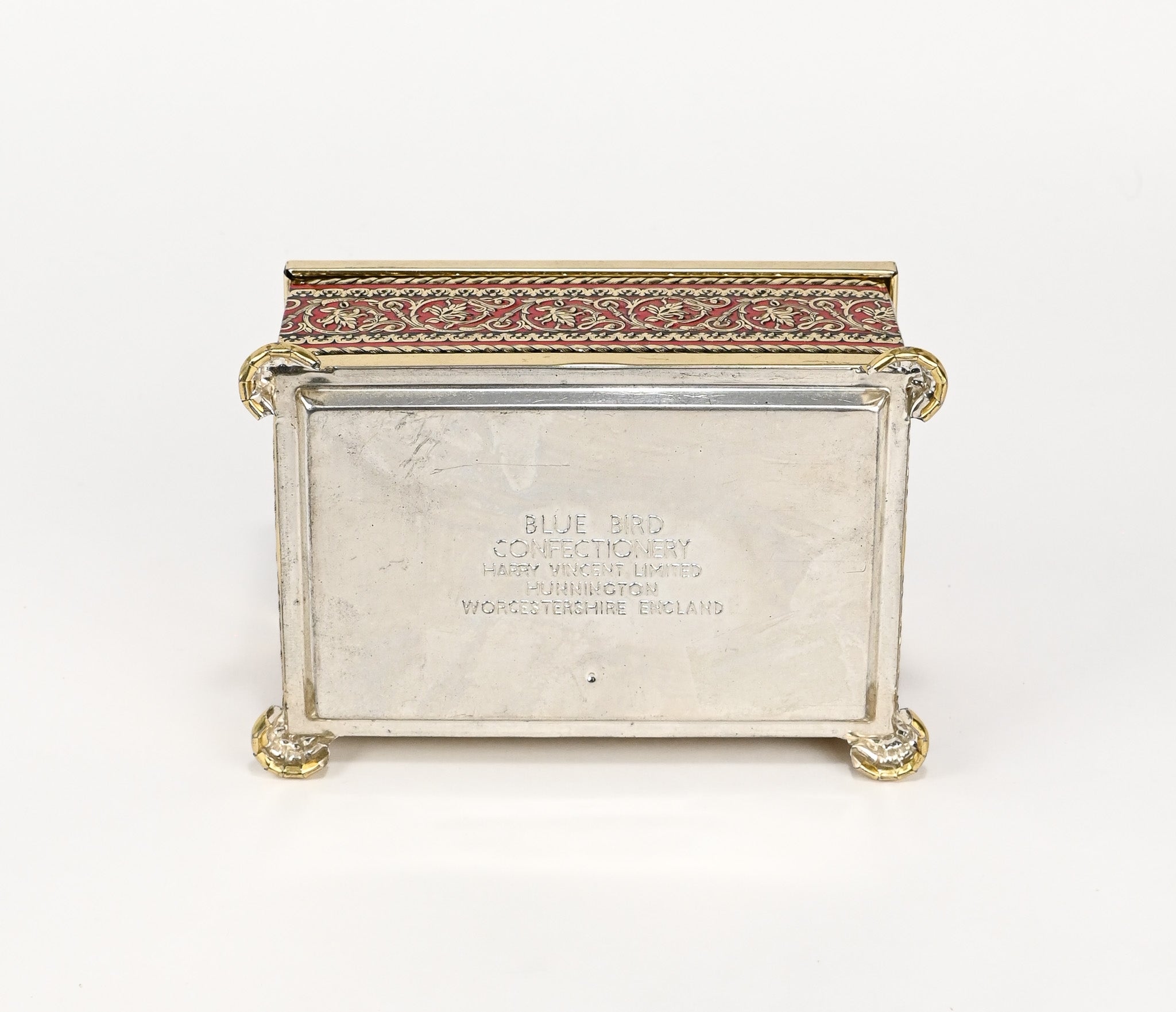 Vintage Red Felted & Gold Tone BLUE BIRD CONFECTIONARY Tin Box w/ Key Detailing