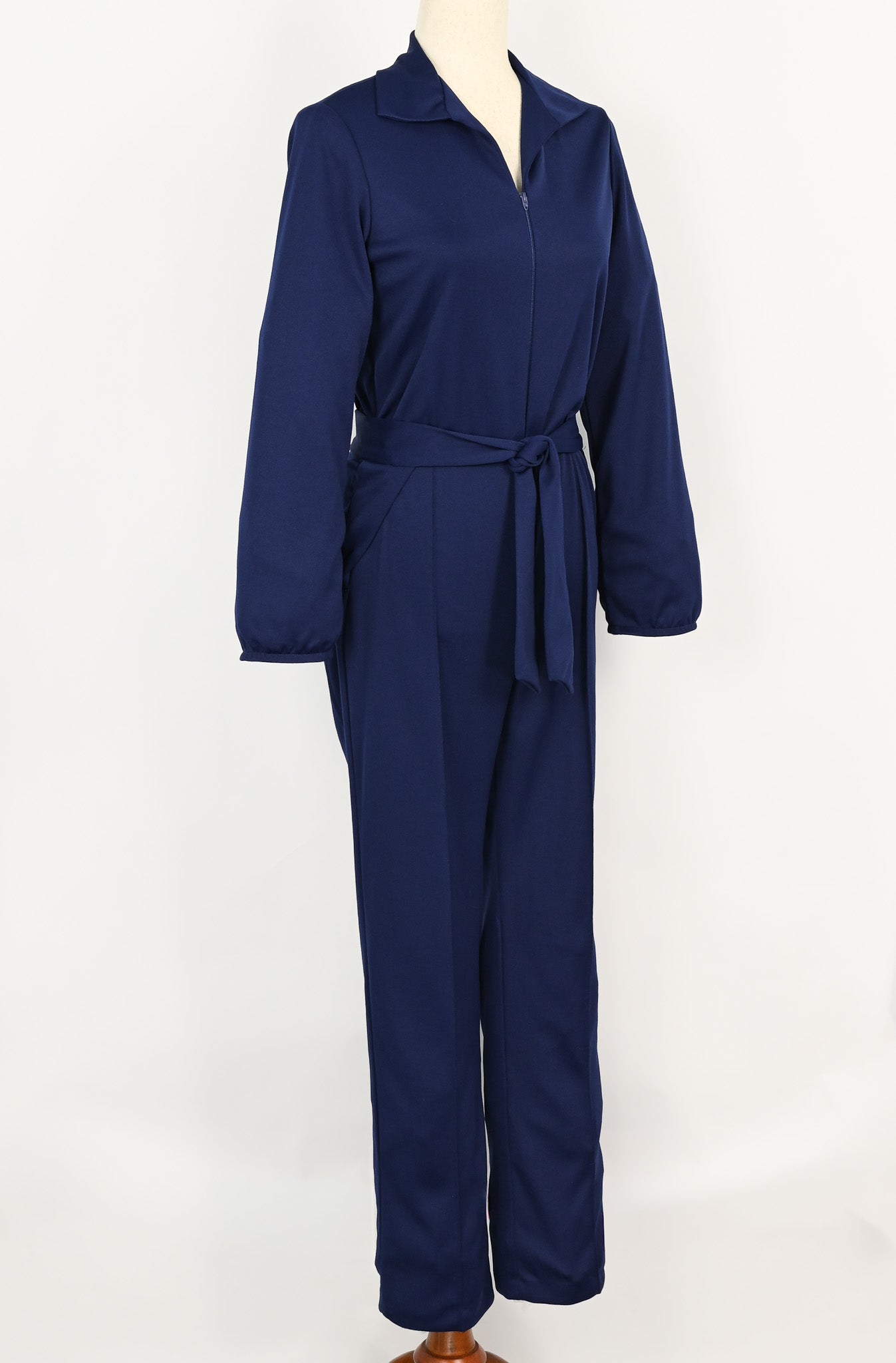 Vintage 70s Dark Blue Polyester ANTHONY RICHARDS Long Sleeve Zip Up Pant Jumpsuit - Truly an iconic, one of a kind 70s jumpsuit. Crafted with a tie drop down back, so you can do your business with ease.