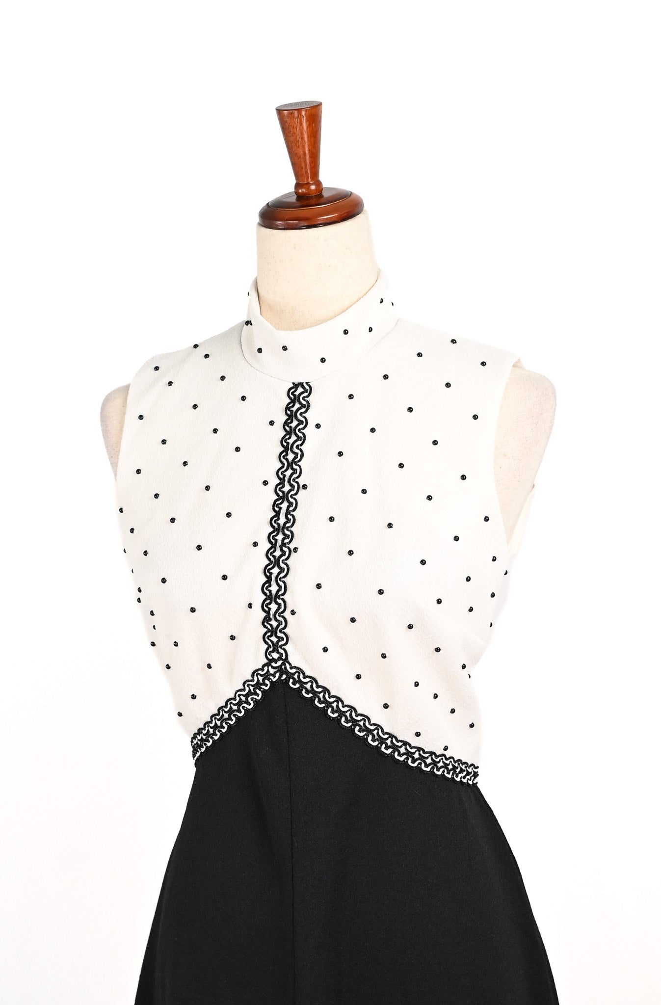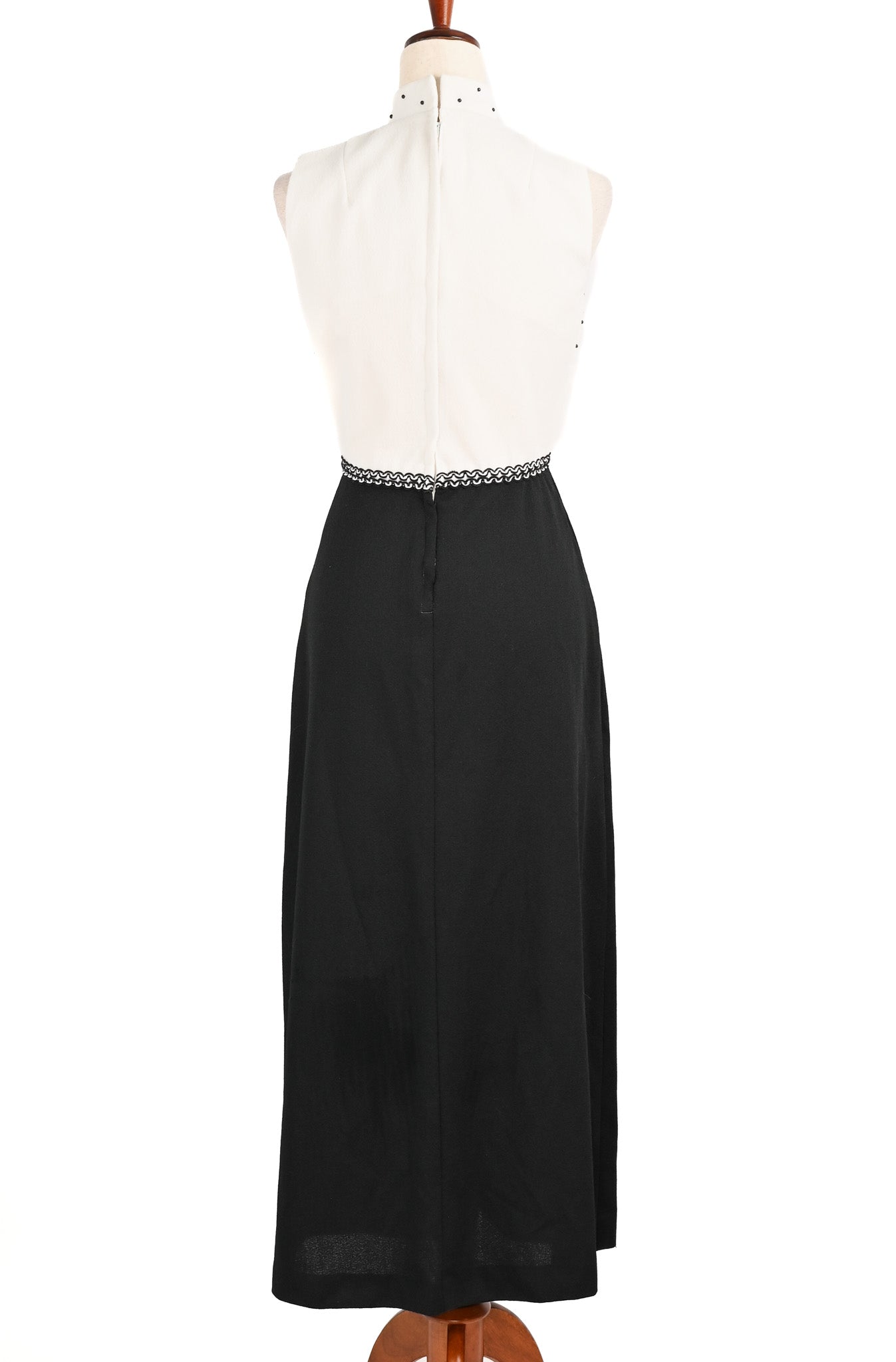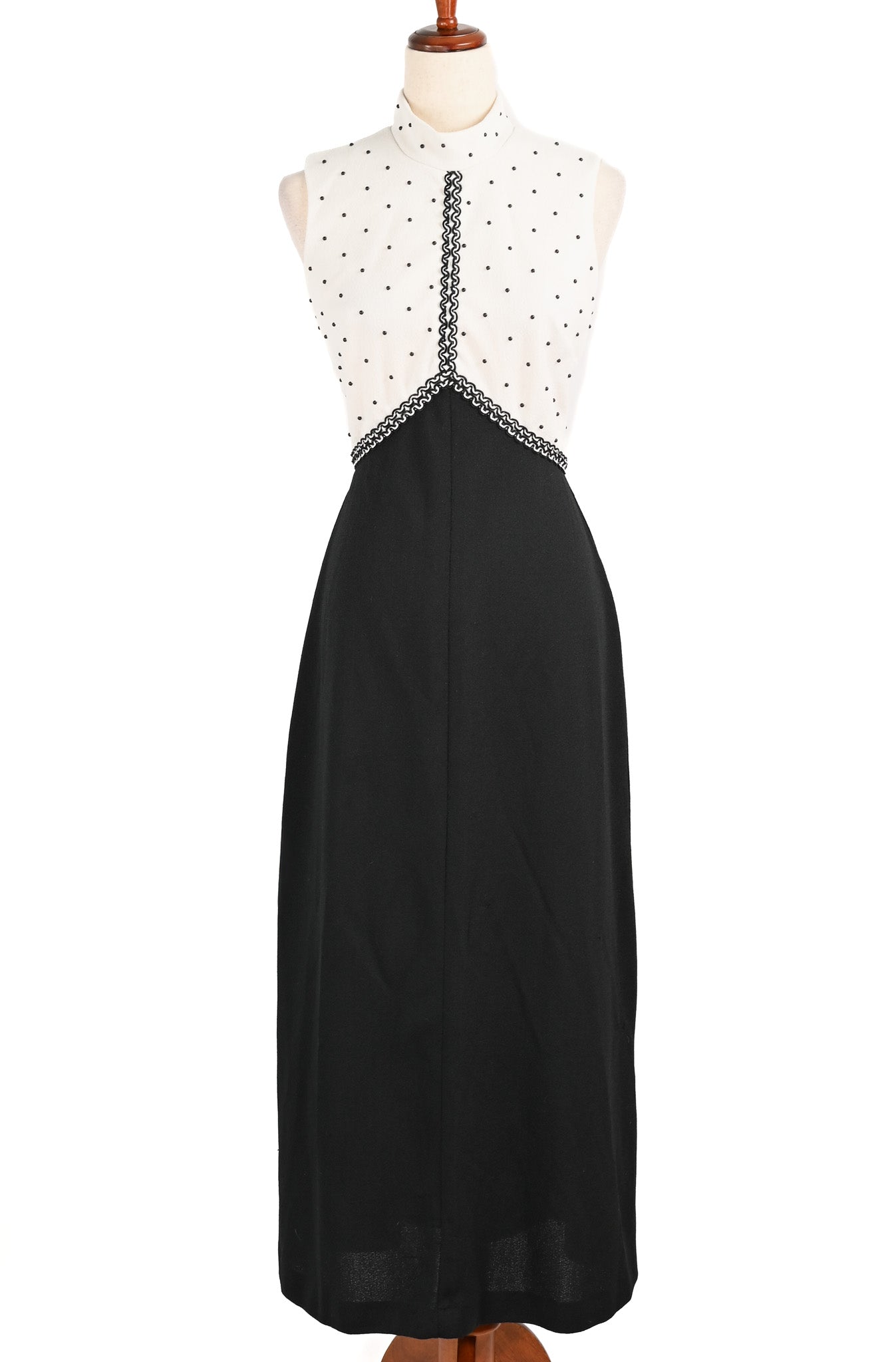 Vintage 60s/70s Black & White UNBRANDED Polyester Sleeveless Mock Neck Maxi Dress - Truly a stunning piece from the 70s. This maxi features black beaded polka dot detailing to the bust area, along with black rope accent pieces, and then draped down into a black maxi skirt.