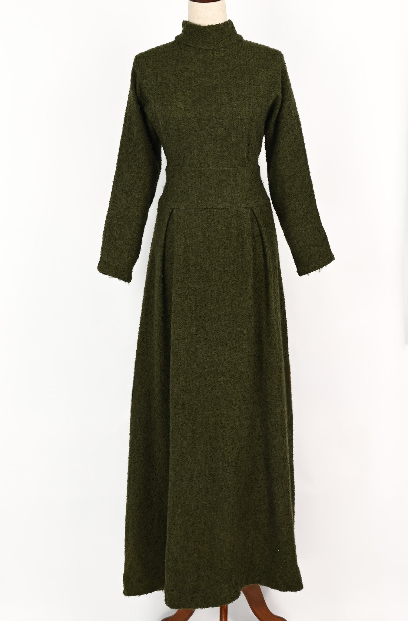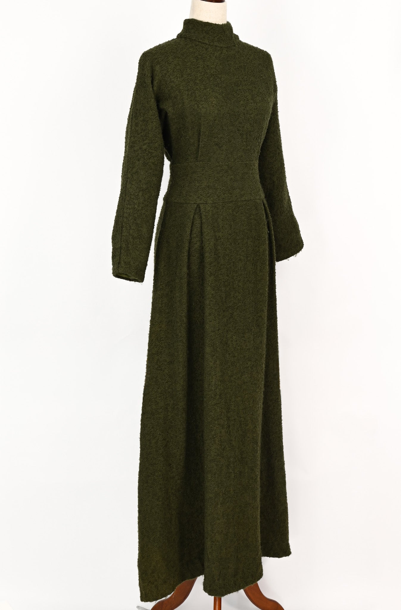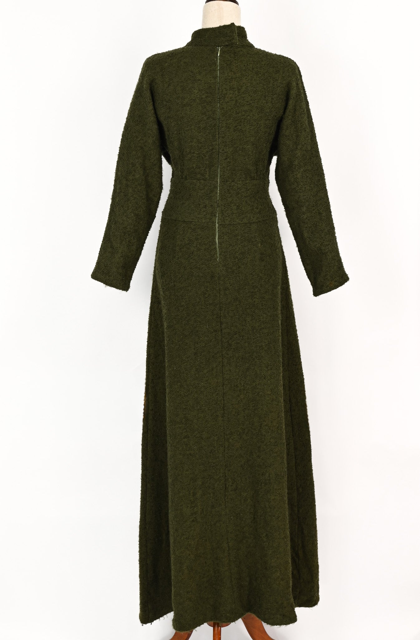 Vintage 60s/70s Olive Green Heavy Bouclé Wool Long Sleeve Maxi Dress