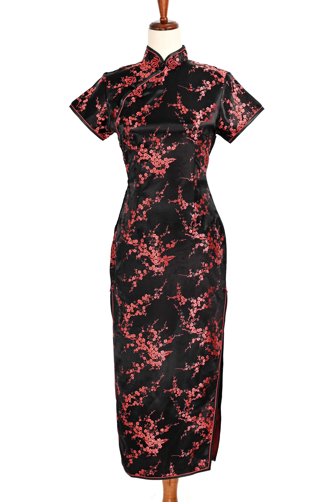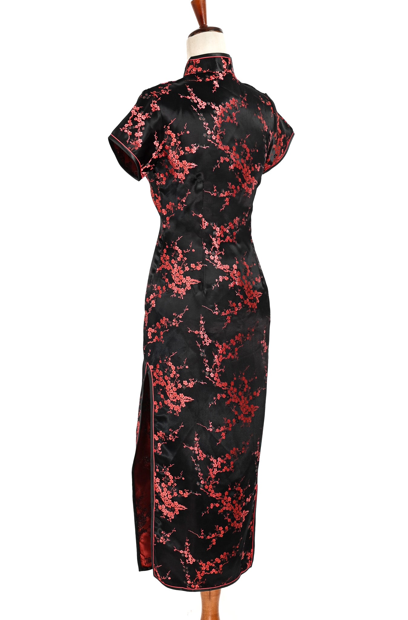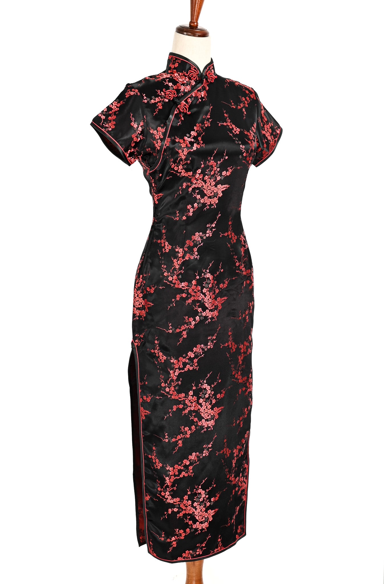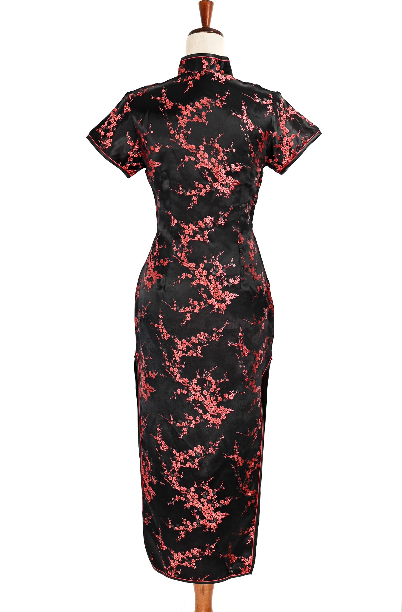 Black & Red Floral Cheongsam SI MEI JIN Dress - So slinky, so seductive, a great date night dress. This dress features an array of red flowers all along the dress with two seductive slits along the sides of the bottom of the dress. Near the top of the dress features knot and loop closures for more added sophistication and style.