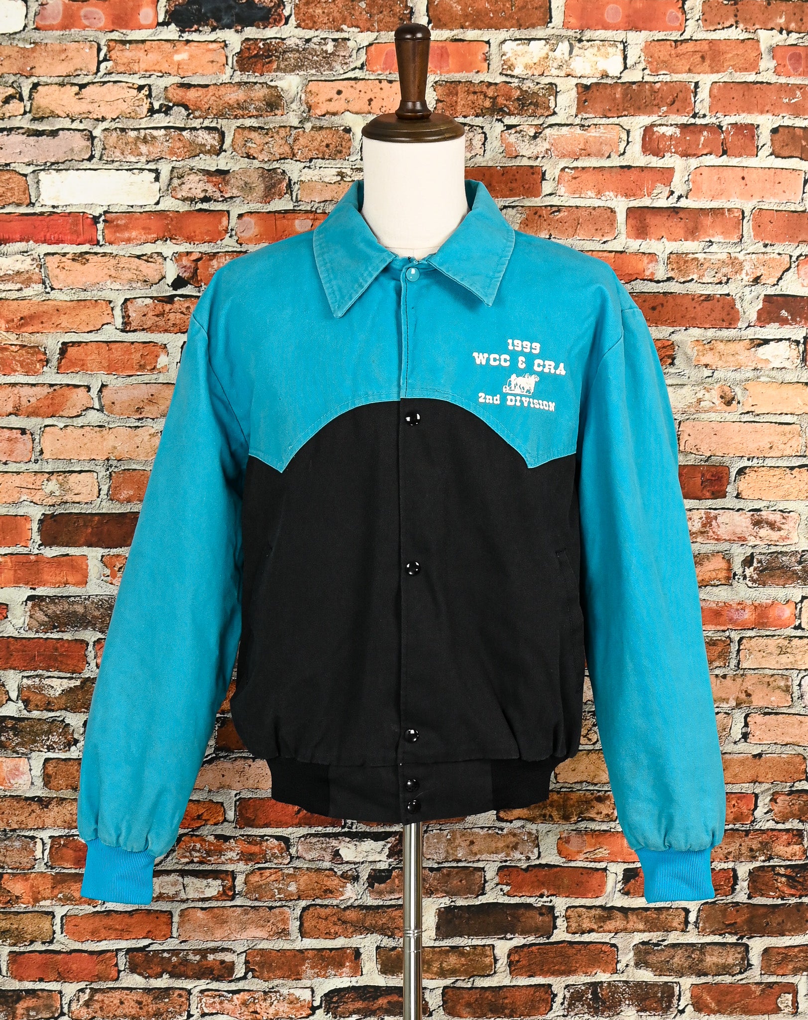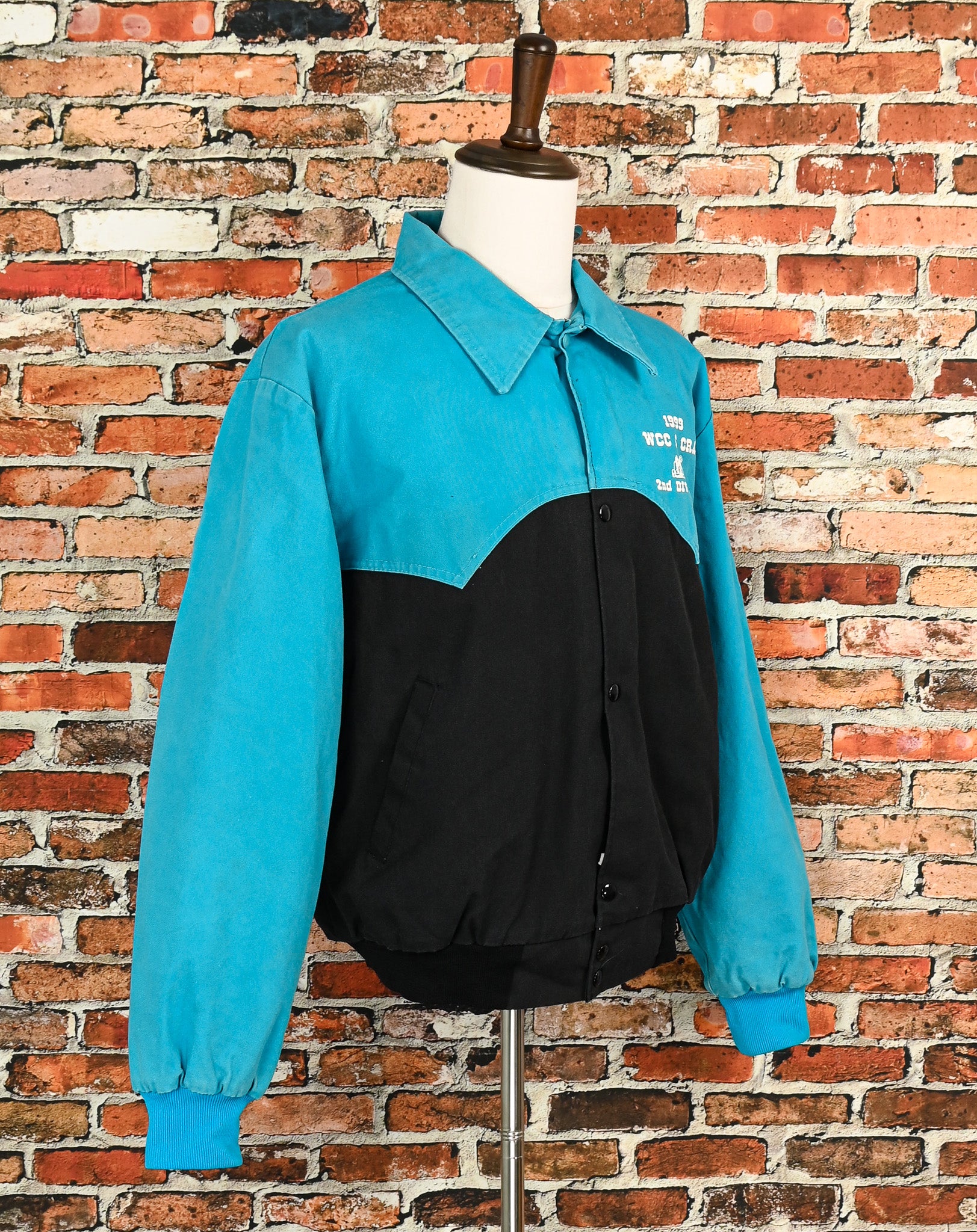Vintage 90's Blue & Black WEST ARK Polyester Bomber Snap Button Jacket - "1999 World Champions / Cutter & Chariot Racing / Sponsored by Hollis Concrete" has been screen printed onto the jacket.