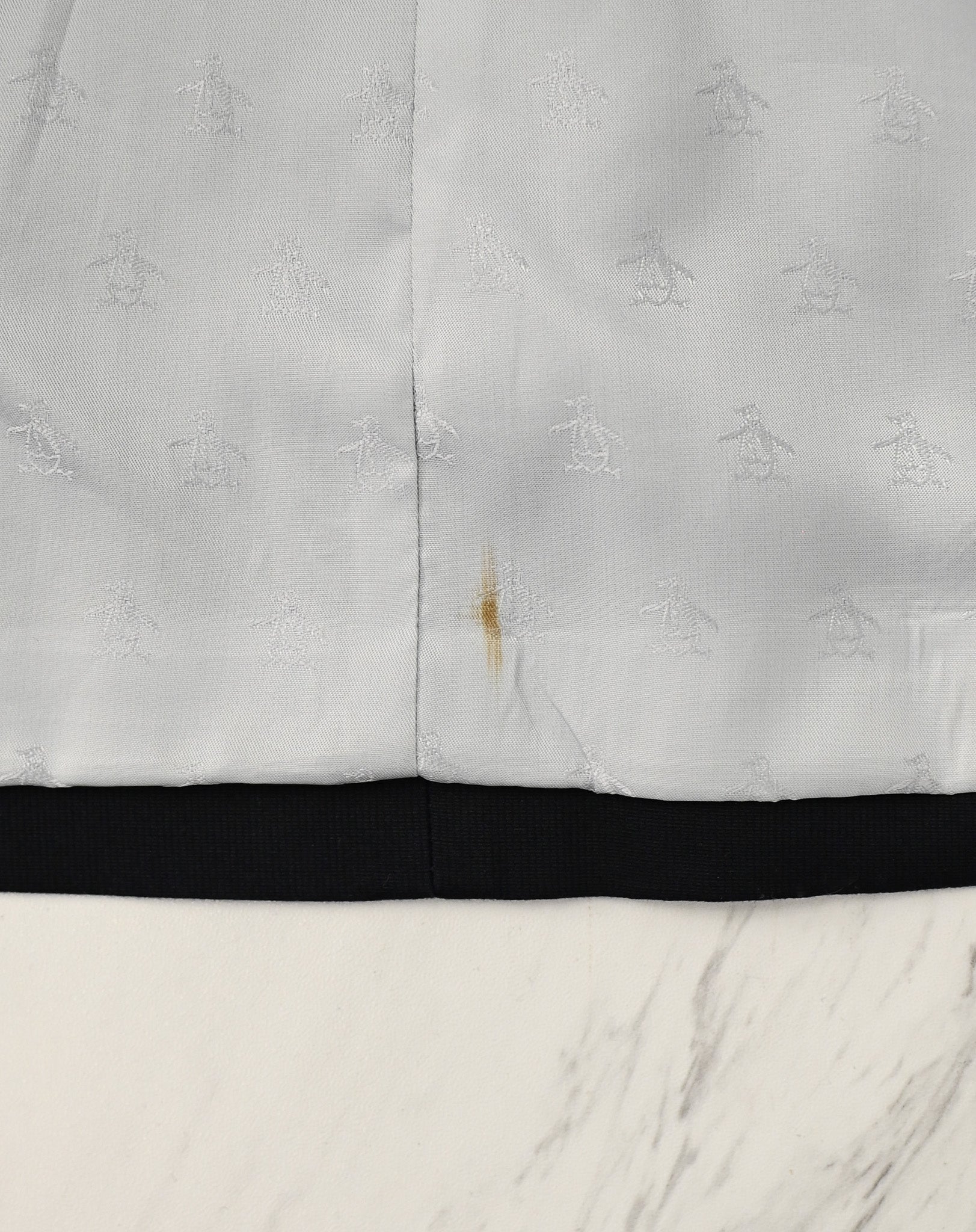 There are signs of wear due to age, use, and storage; such as a minor discoloration spot on the lining, and discoloration wear on the left sleeve.