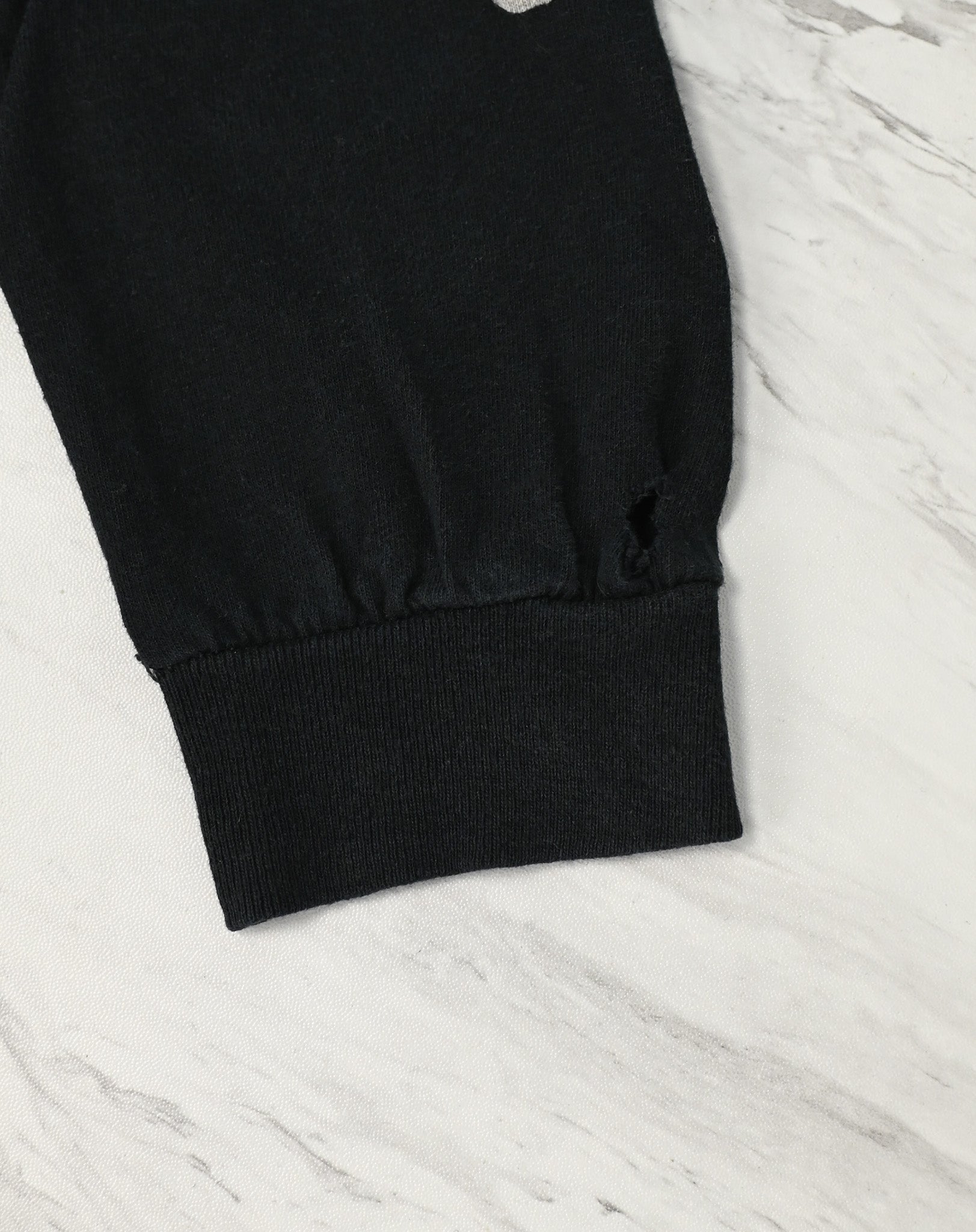 There are signs of wear due to age, use, and storage; such as holes near both sleeve cuffs.