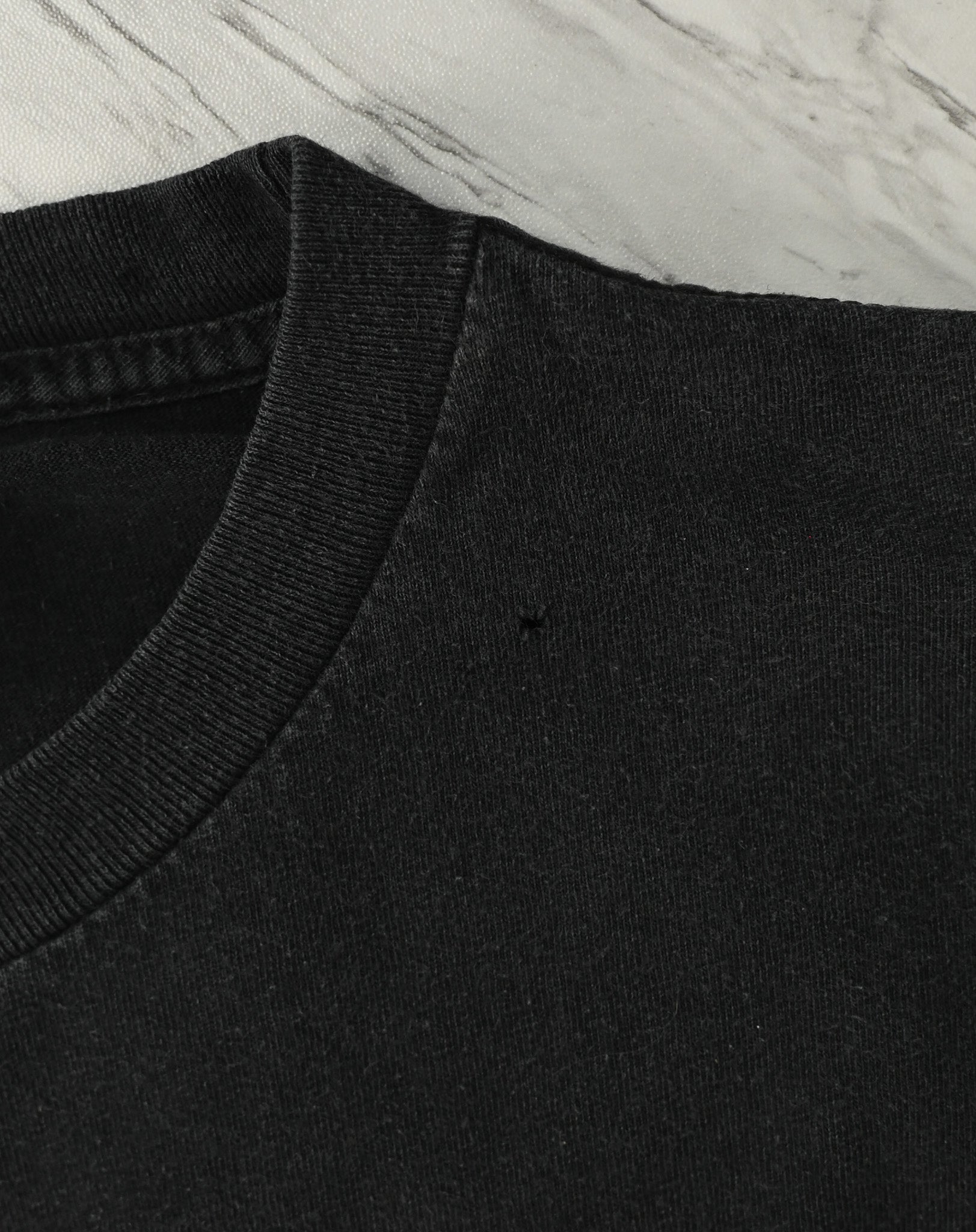 There are signs of wear such as two small holes near the right side, a hole near the collar, wear to the black, and cracking to the print.