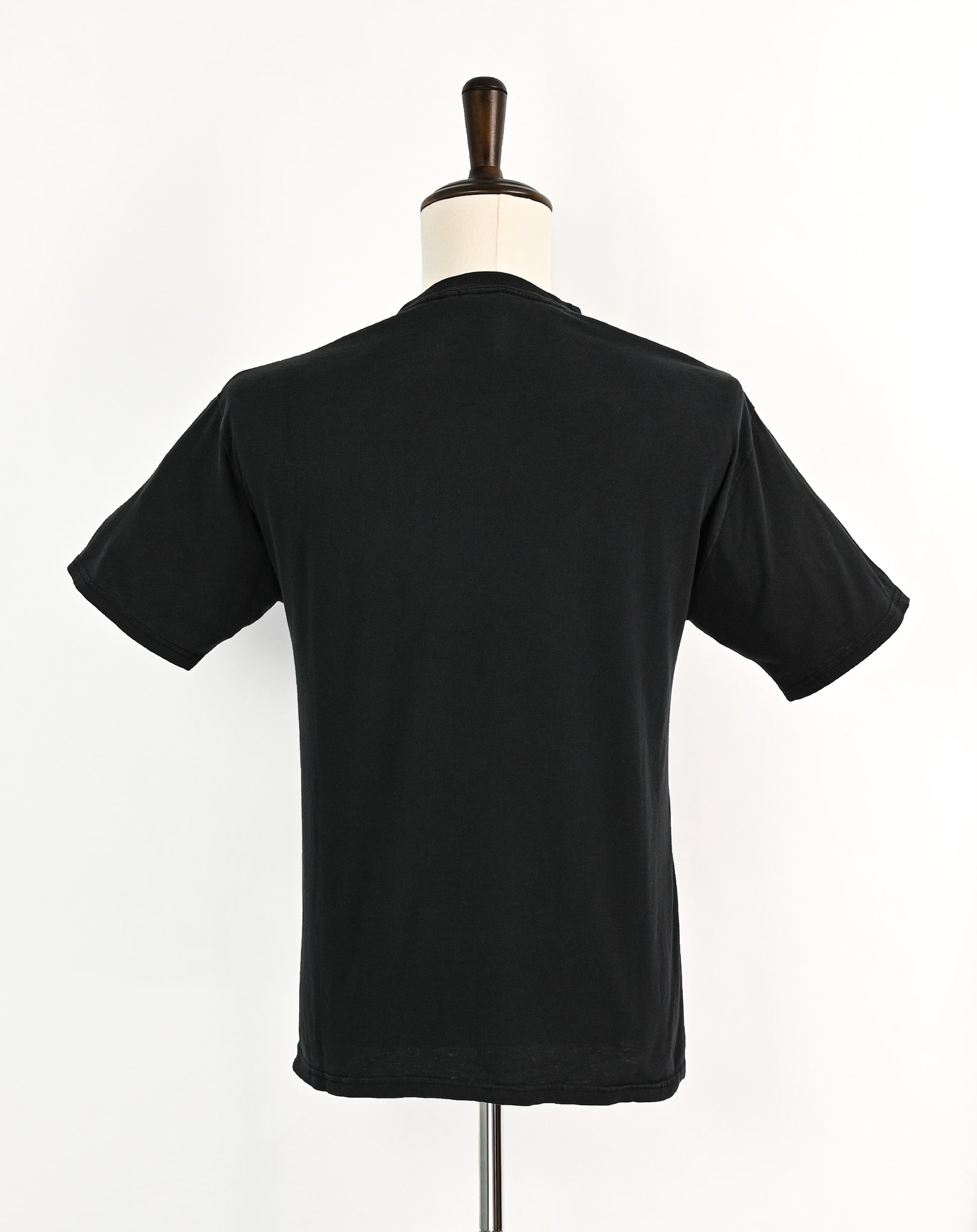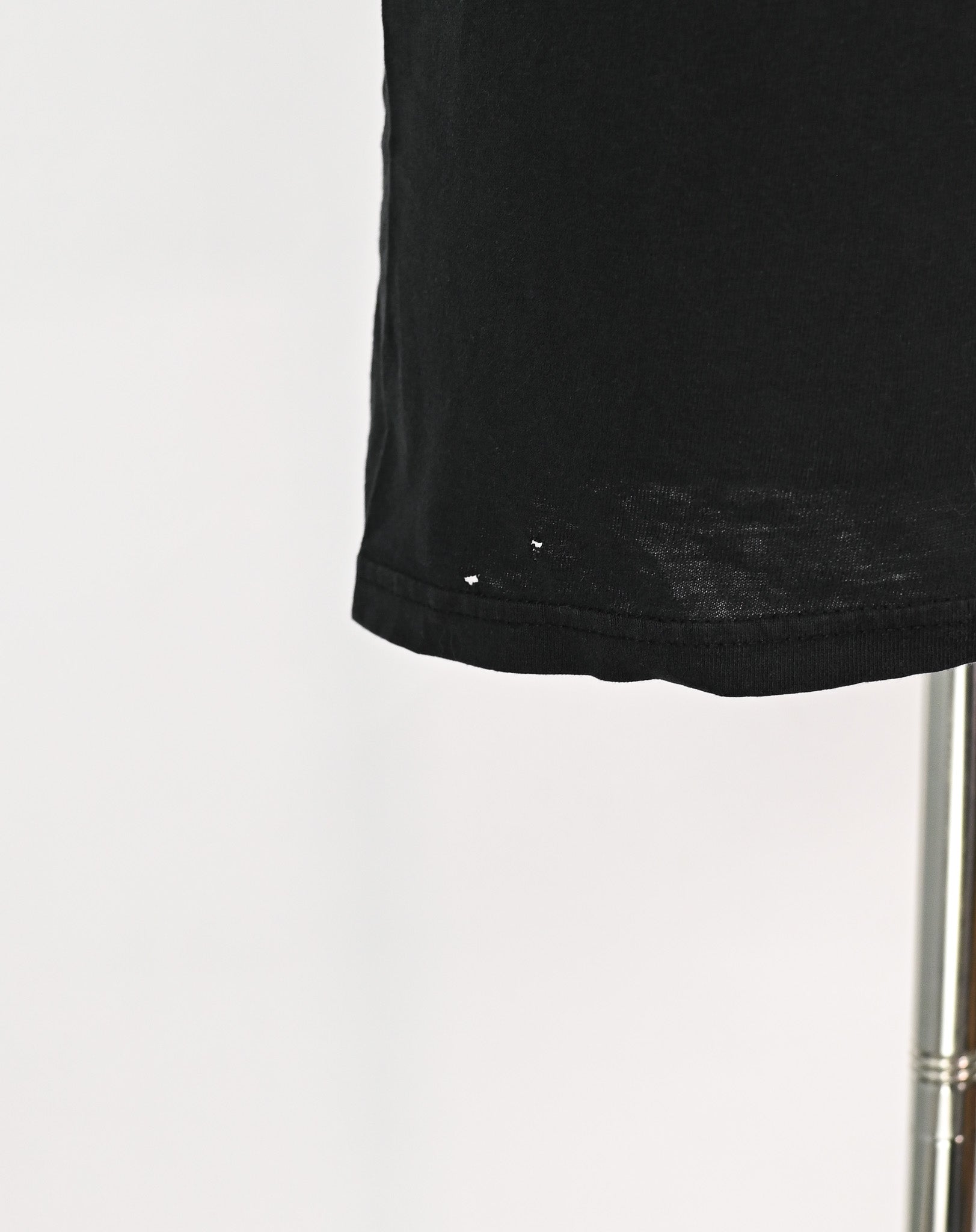 There is a few small holes on the shirt, two small holes on the front and two small holes in the right armpit. There is also slight wear around the collar, and some fading to the shirt.