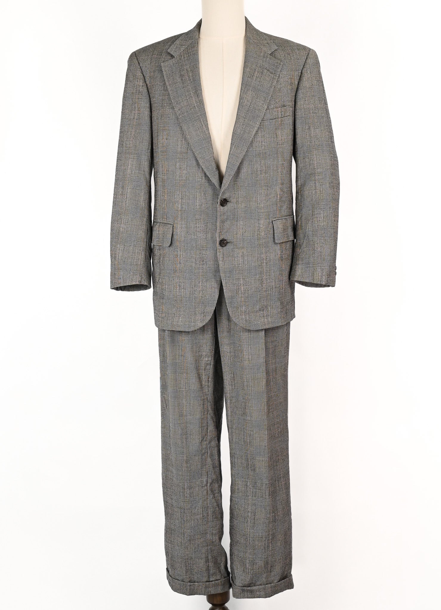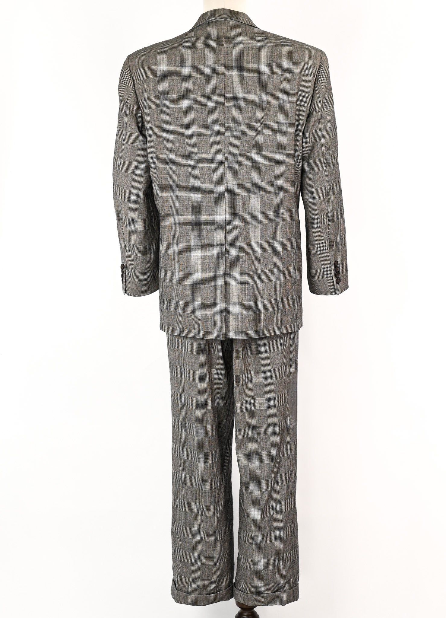 There are signs of wear due to age, use, and storage; such as wear to the fabric, two minor pinholes around the crotch area, a minor pinhole on the right shoulder, minor wear to the lining in both sleeve openings, and minor discoloration to the inside collar of the jacket.