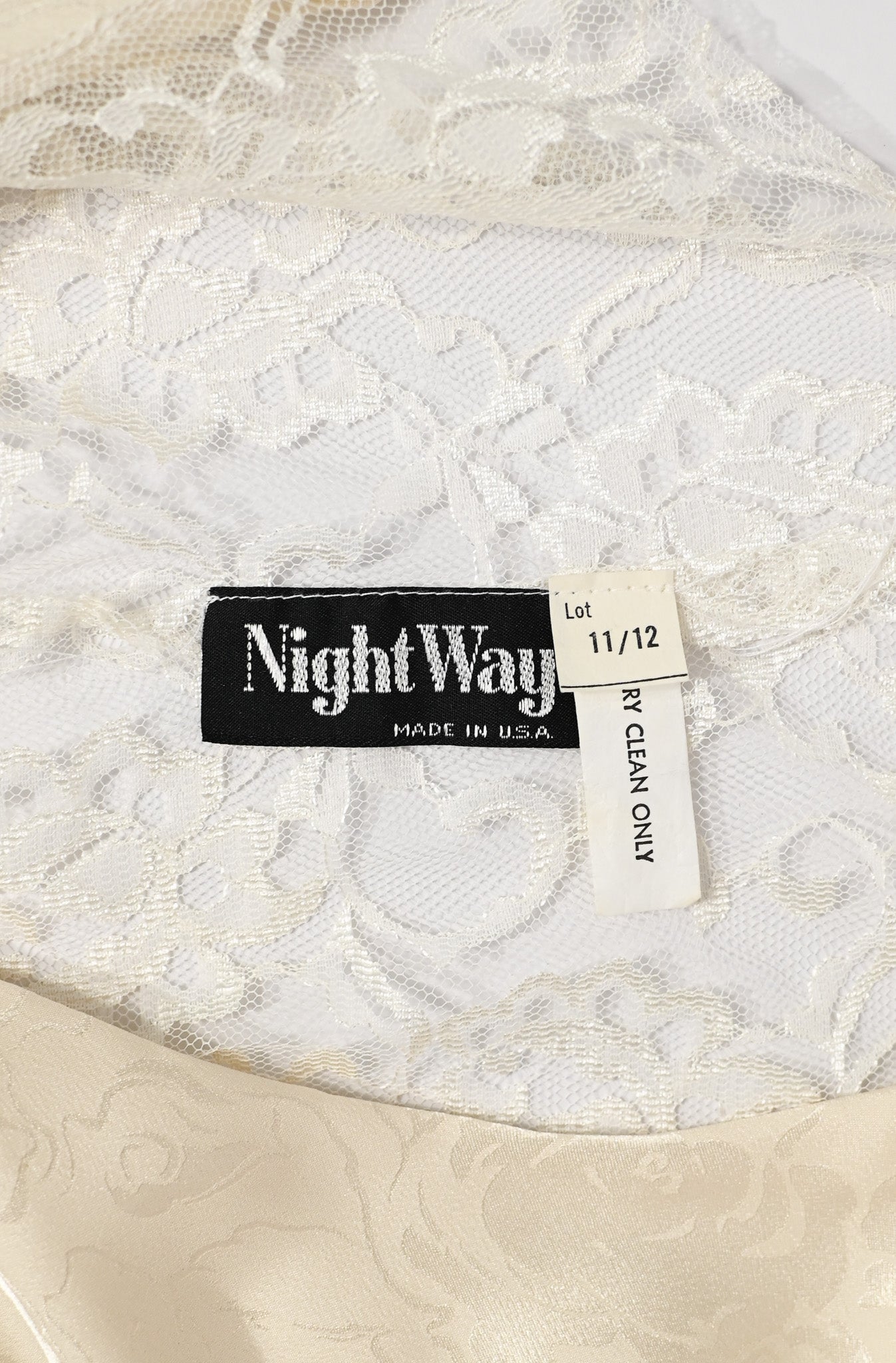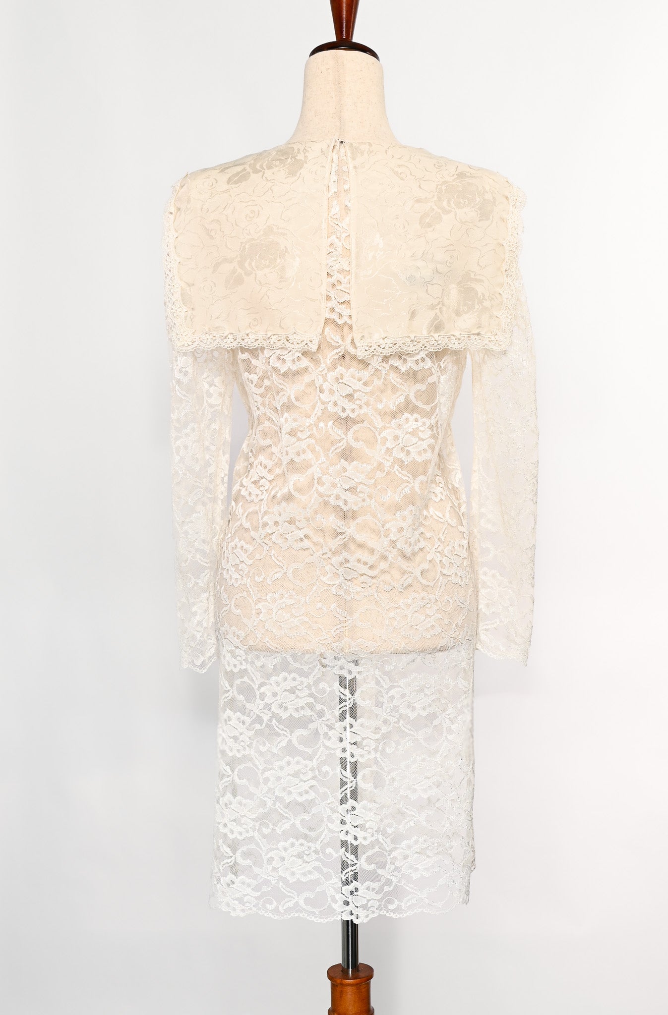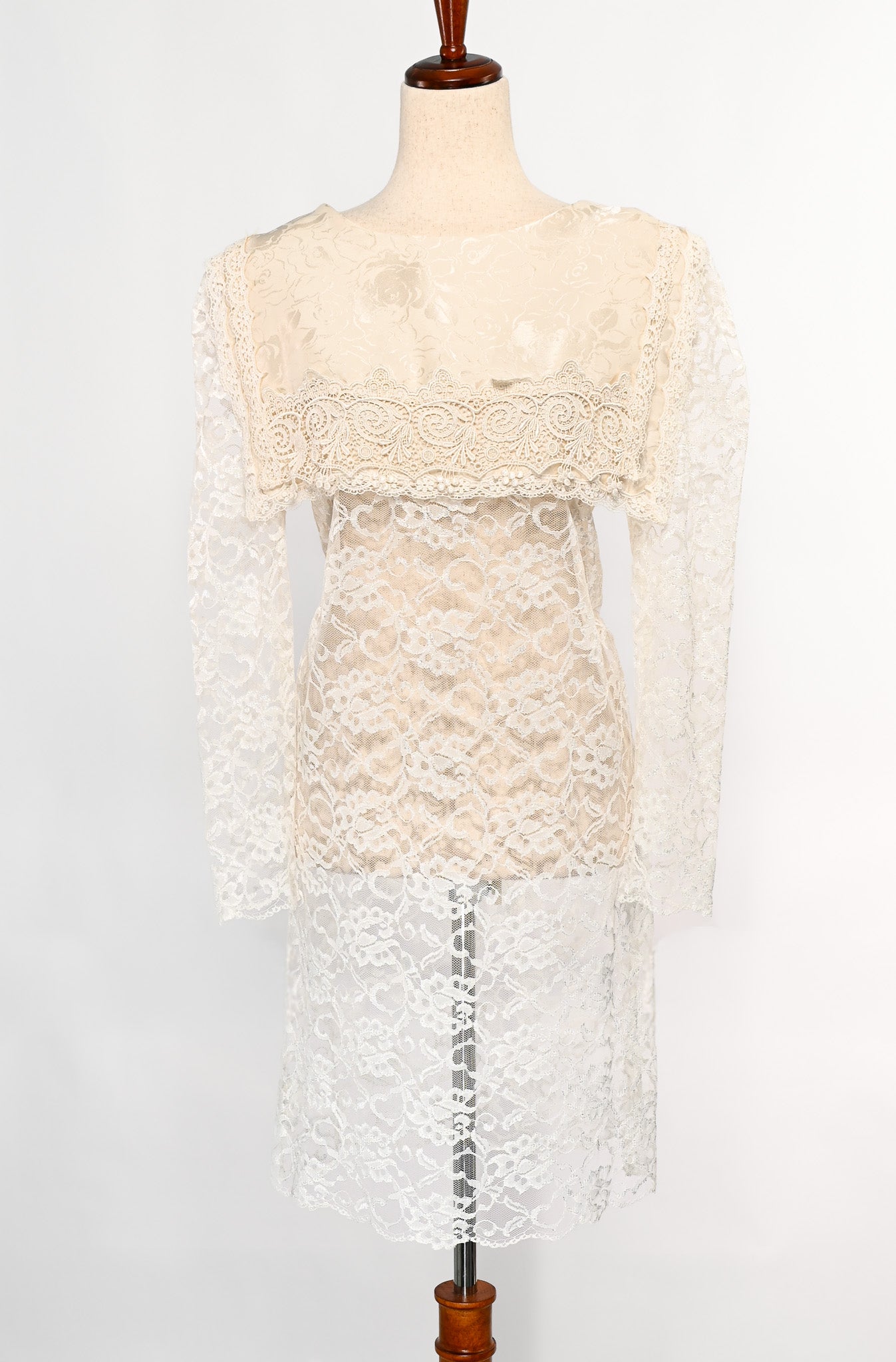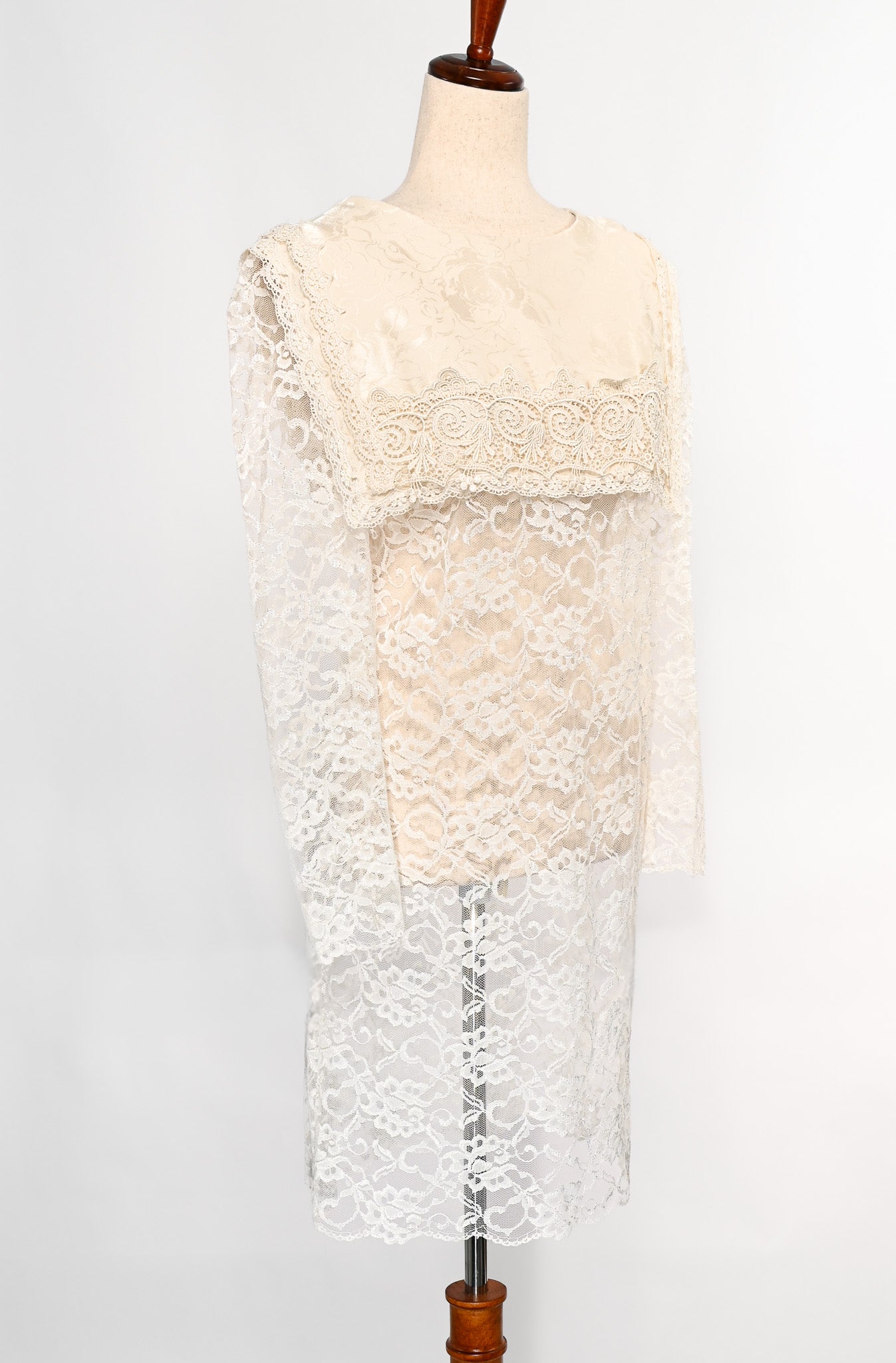 Vintage 80s Ivory & White Sheer Lace NIGHT WAY Bib Style Long Sleeve Midi Dress - 11/12