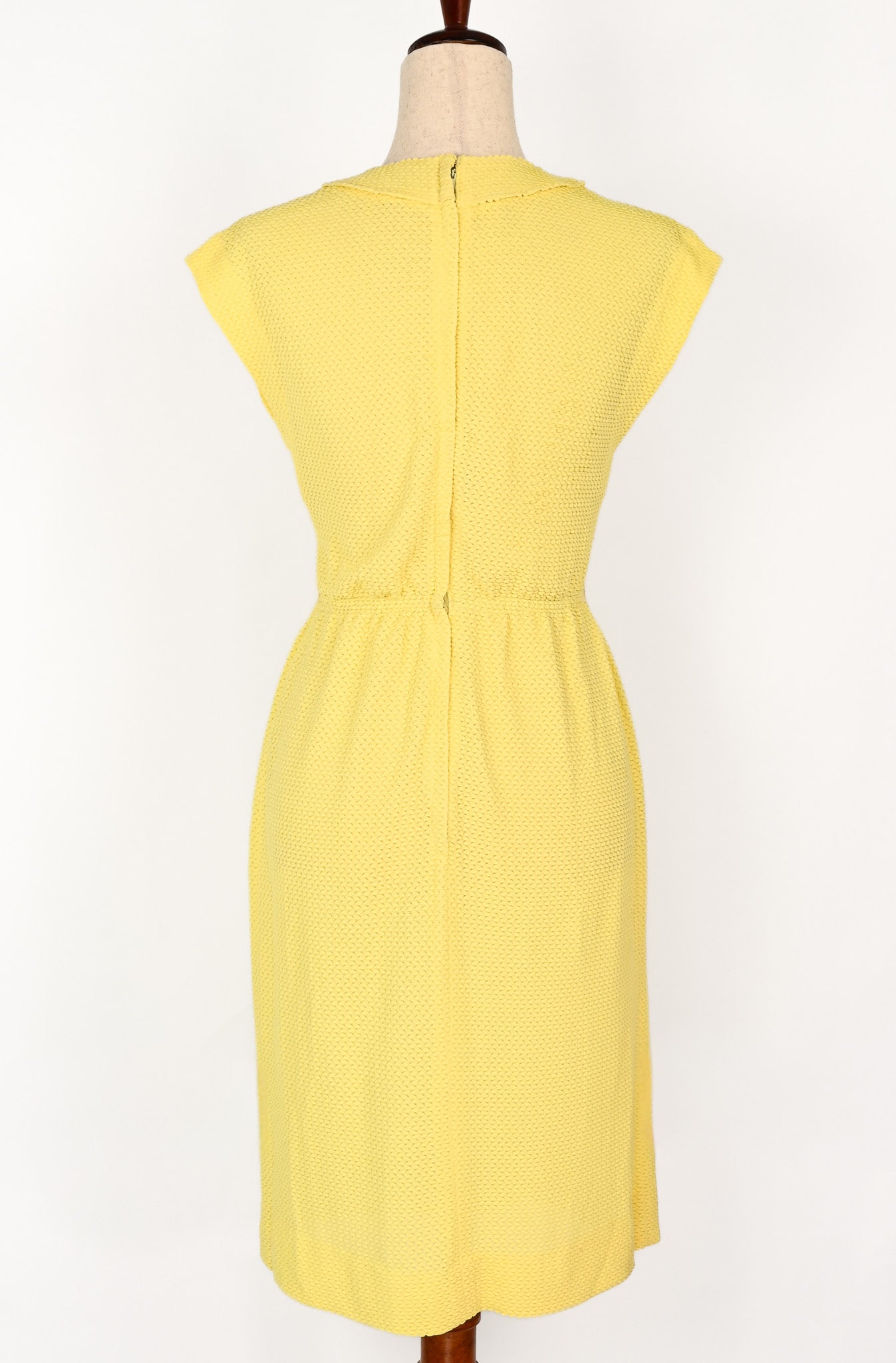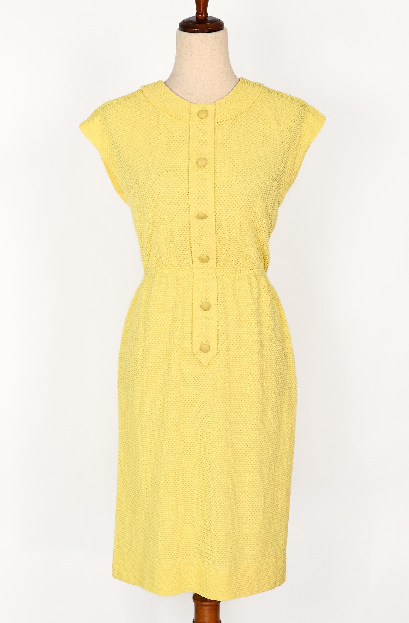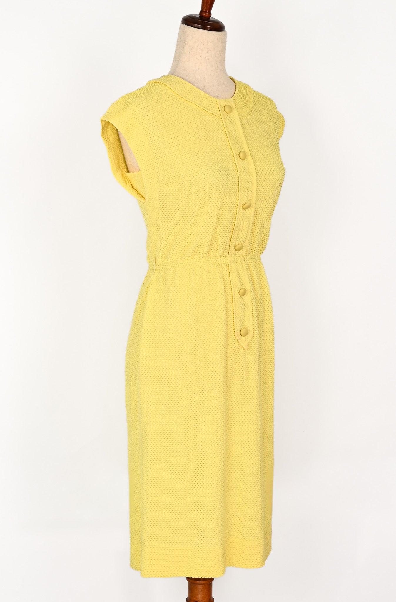 Vintage 50s Yellow Textured Polyester LESLIE FAY Button Up Cap Sleeve Midi Dress