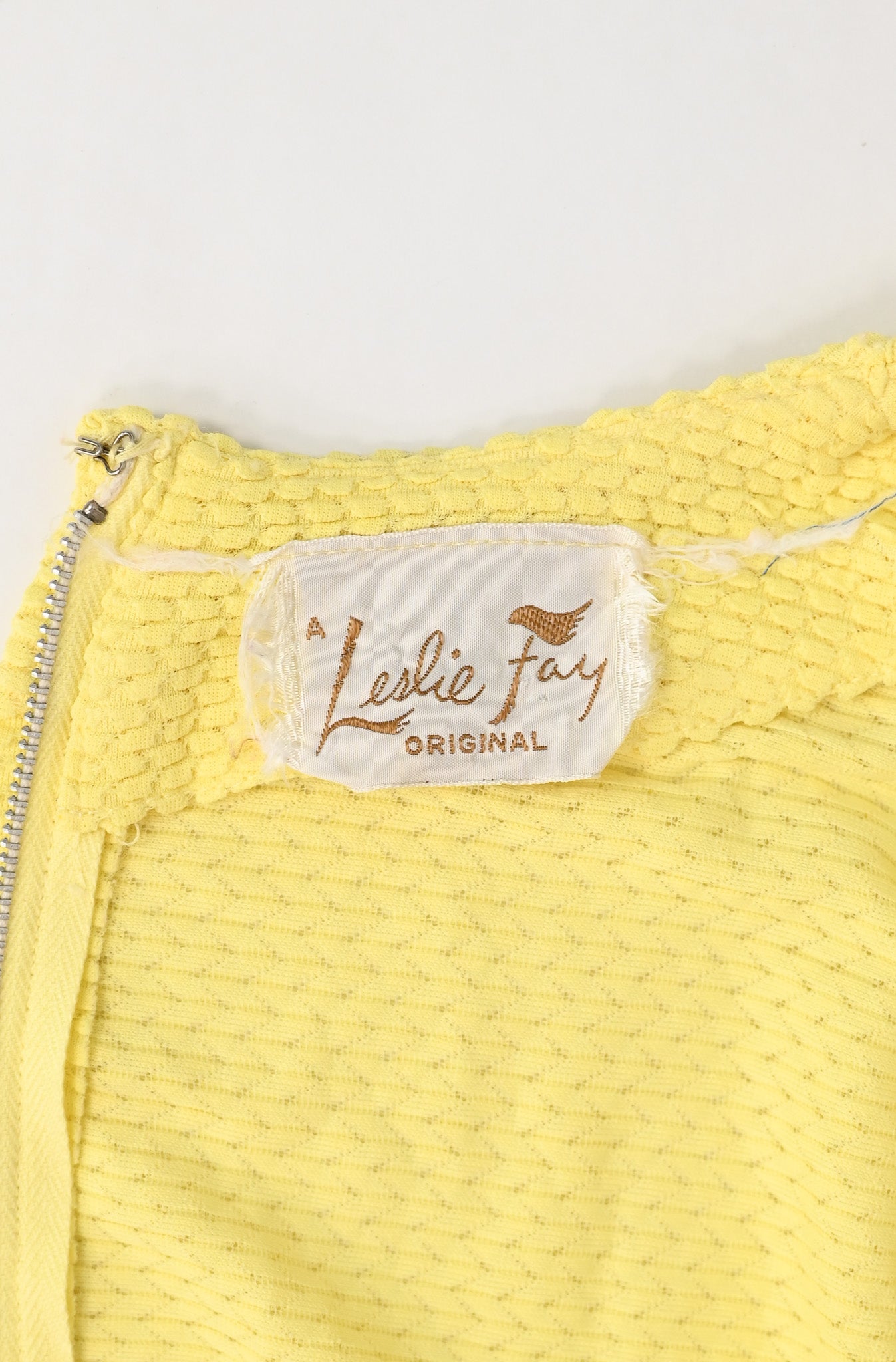 Vintage 50s Yellow Textured Polyester LESLIE FAY Button Up Cap Sleeve Dress - Beautiful in everyway. A dress that stands the test of time.