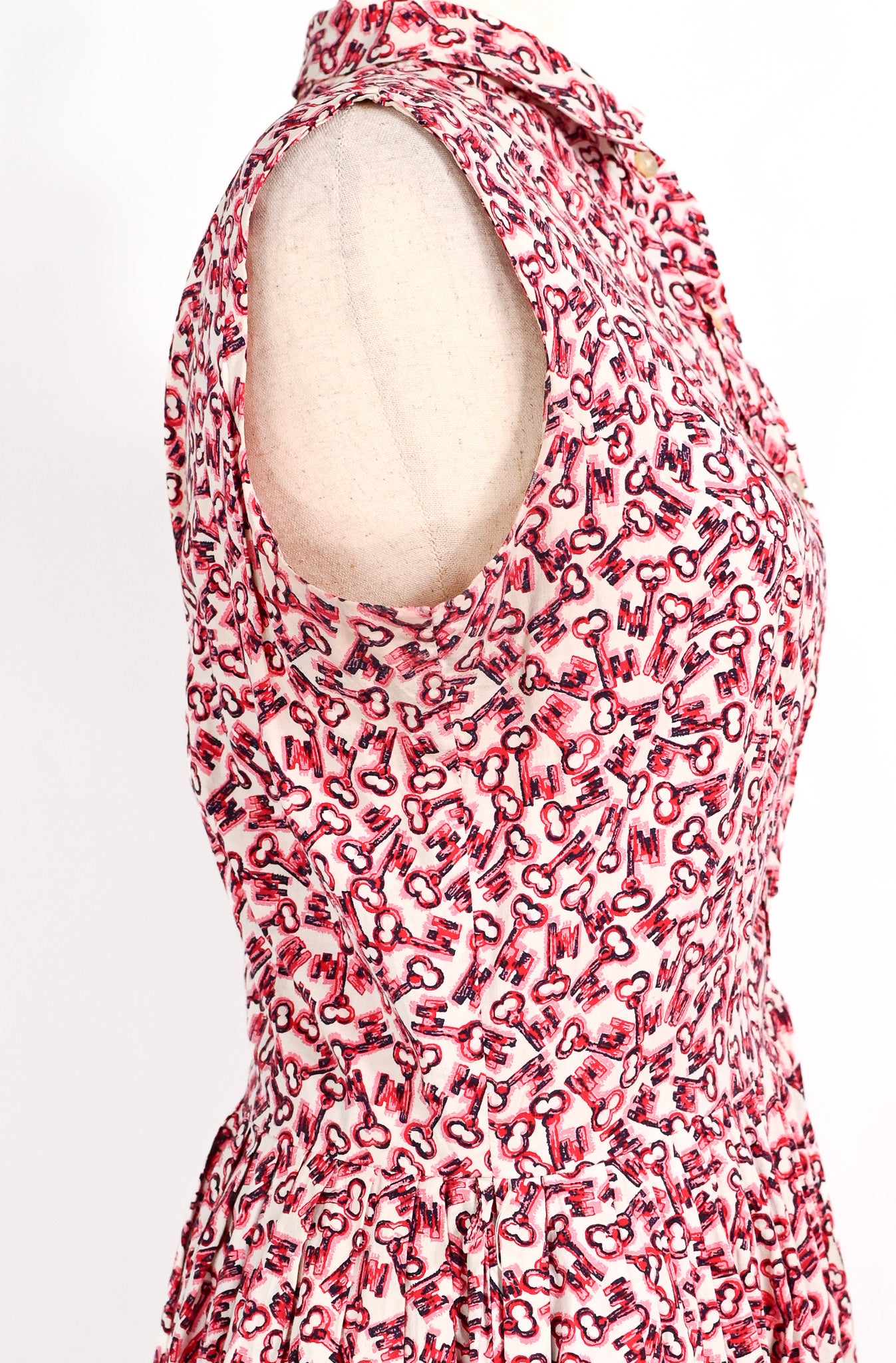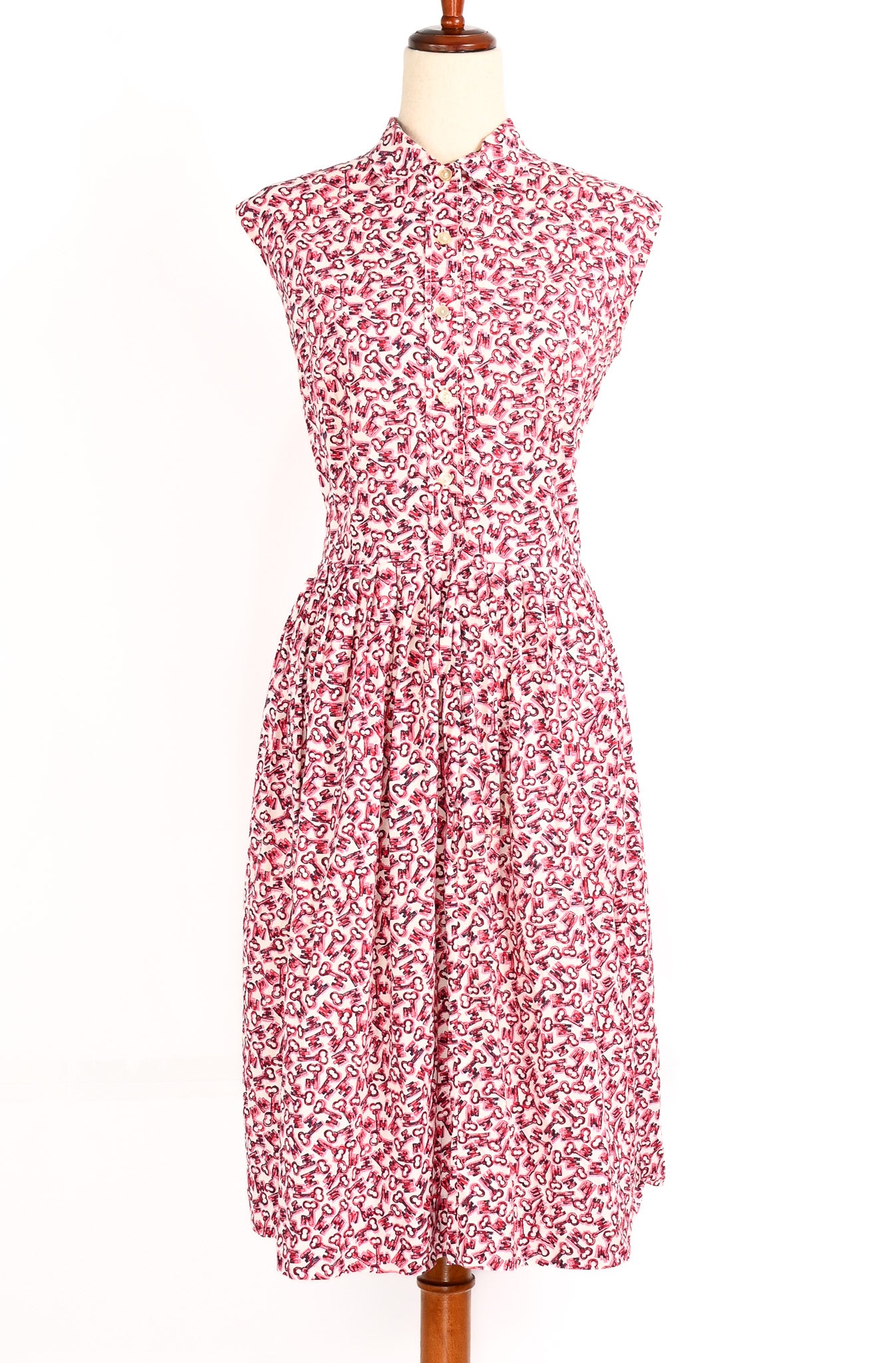 Vintage 50s Red, Pink, & Black Key Print UNBRANDED Shirt Waist Rockabilly Swing Day Dress - Beautifully one of kind. This rarity features a novelty red and pink key print cotton, creating a stunning sleeveless button up style top ,which then is sewn down into a full circle swing skirt.
