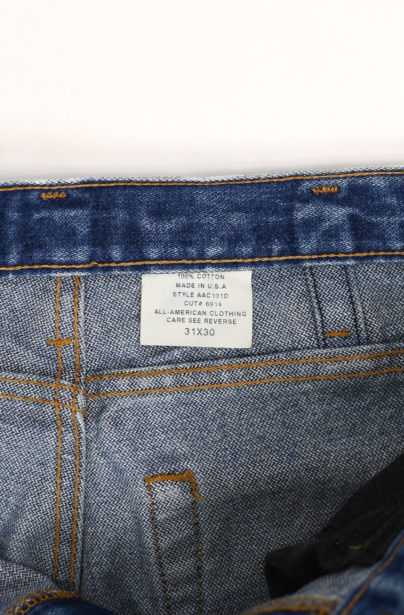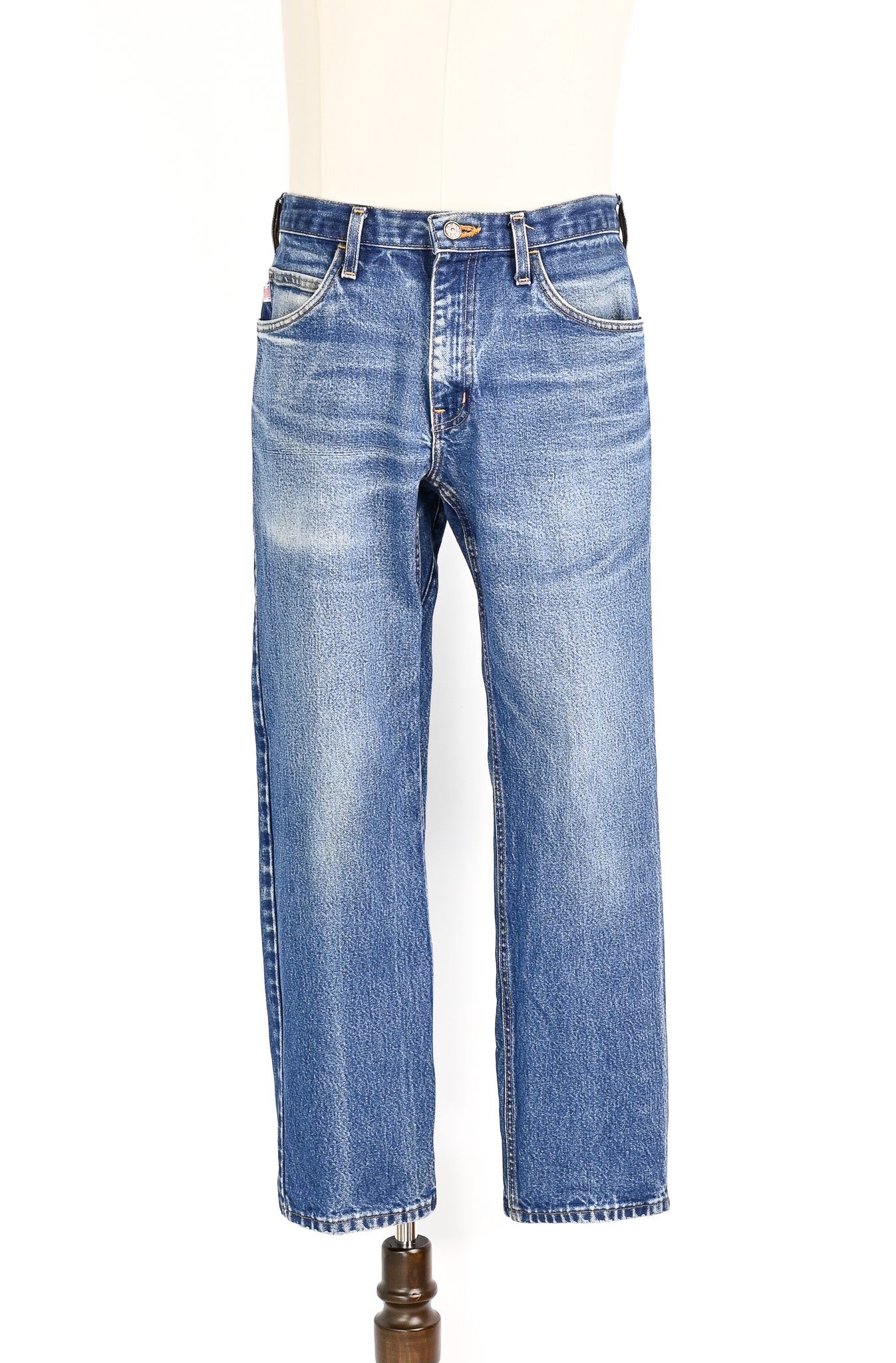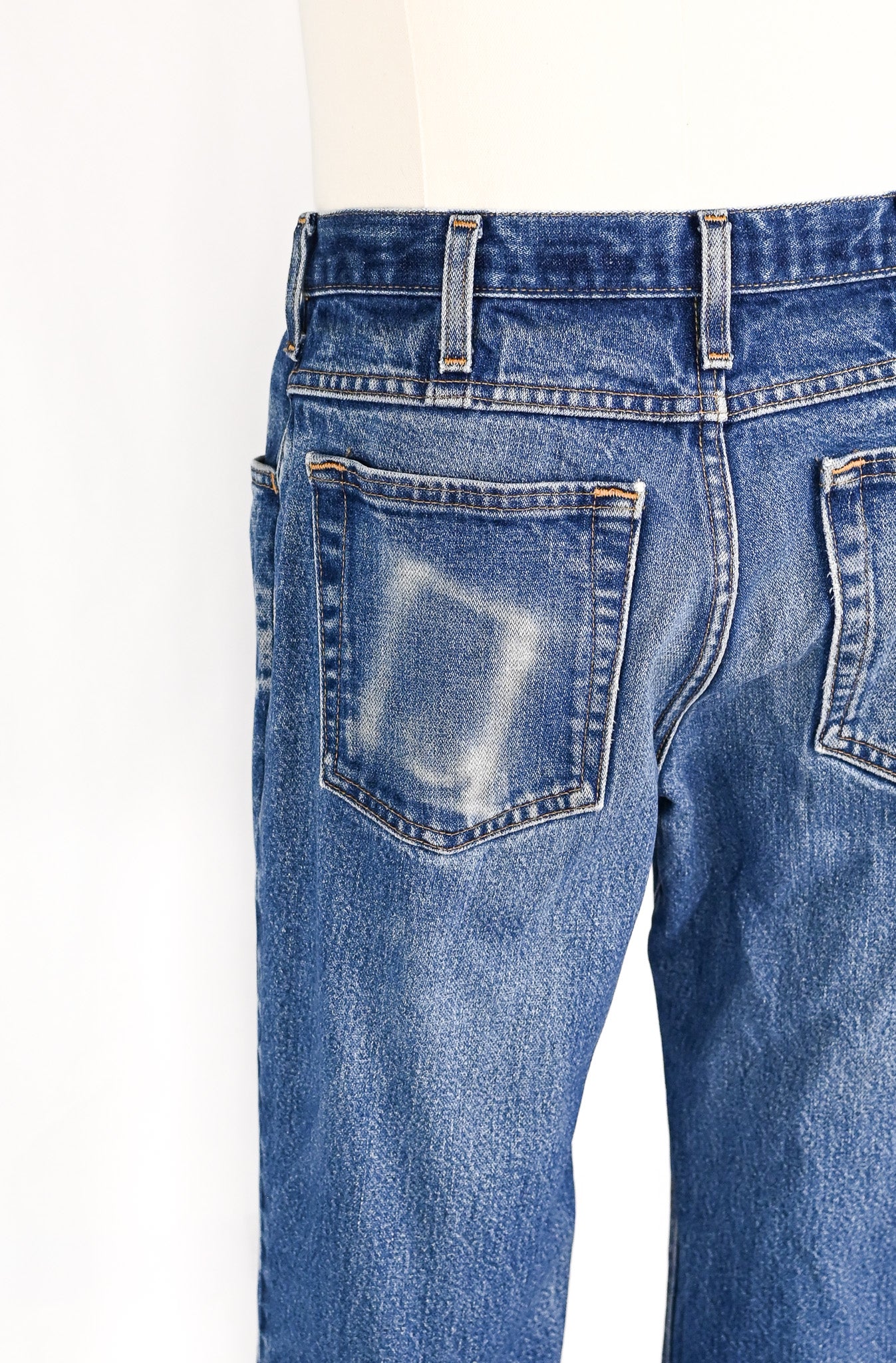 There are signs of wear due to age, use, and storage; such as fading to the denim, a wear spot on the left back pocket, and minor distress to the leg hems.