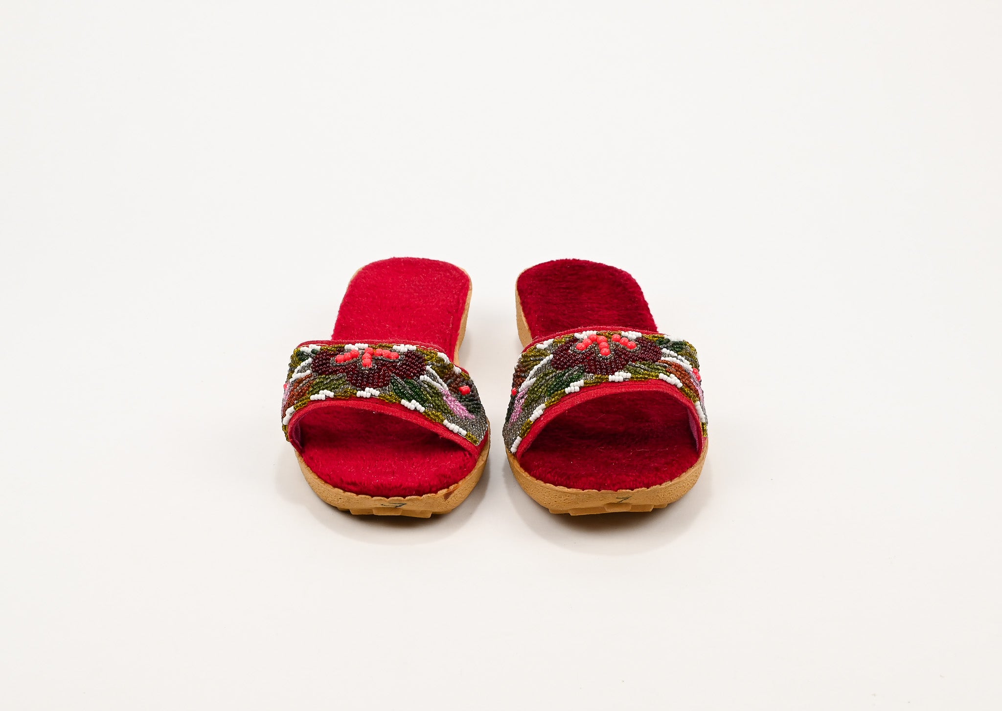 Vintage 50s/60s Beaded Peep Toe Mules House Shoes - Beautifully crafted mules that feature a red faux fur insole and a beaded design.