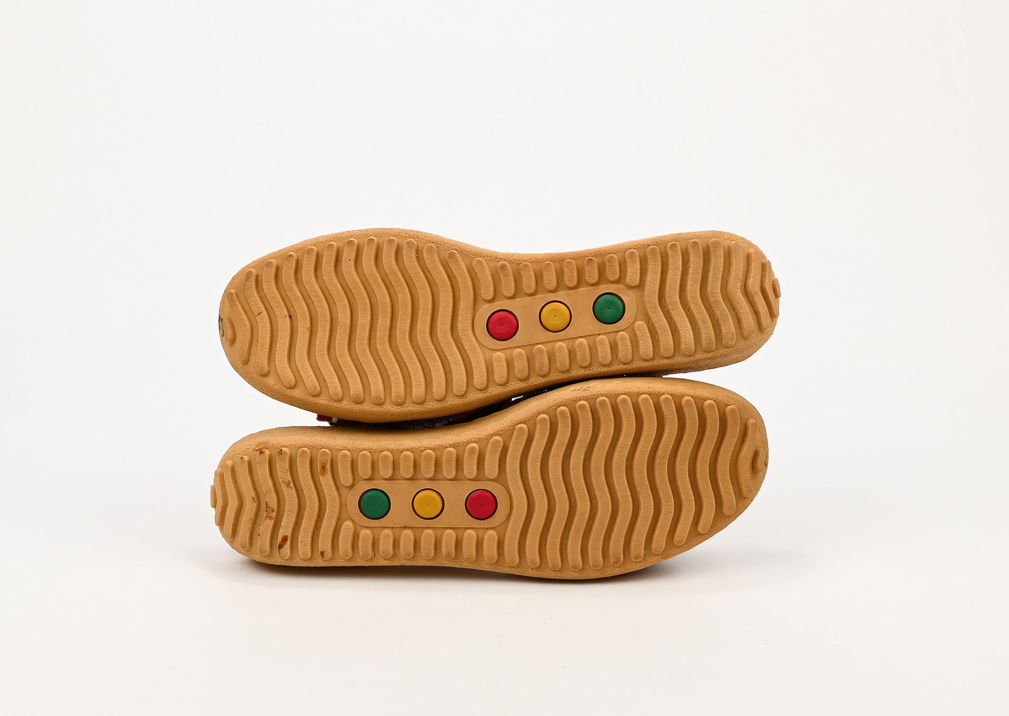 There are signs of wear due to age, use, and storage; such as pen markings on the top of the bottom soles.