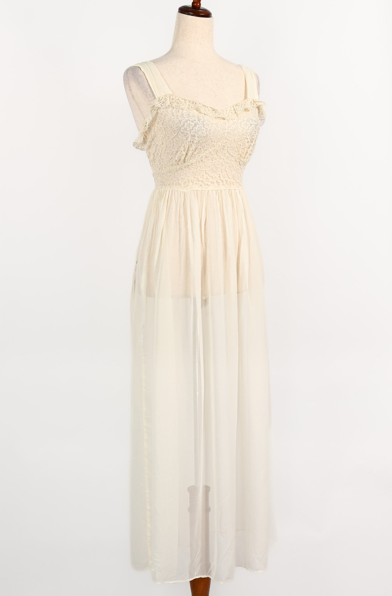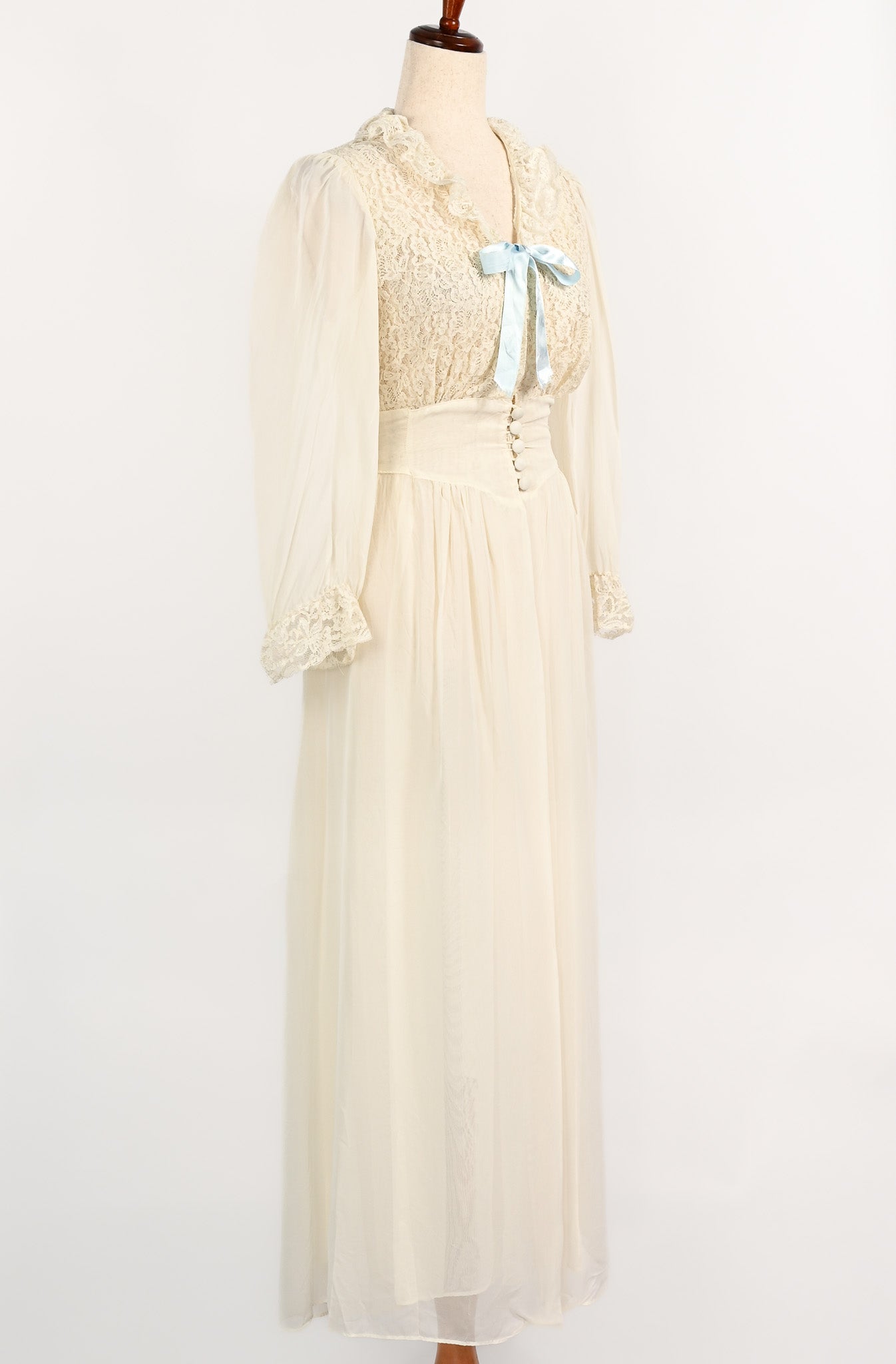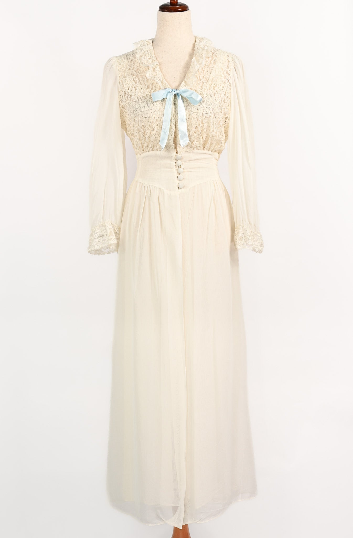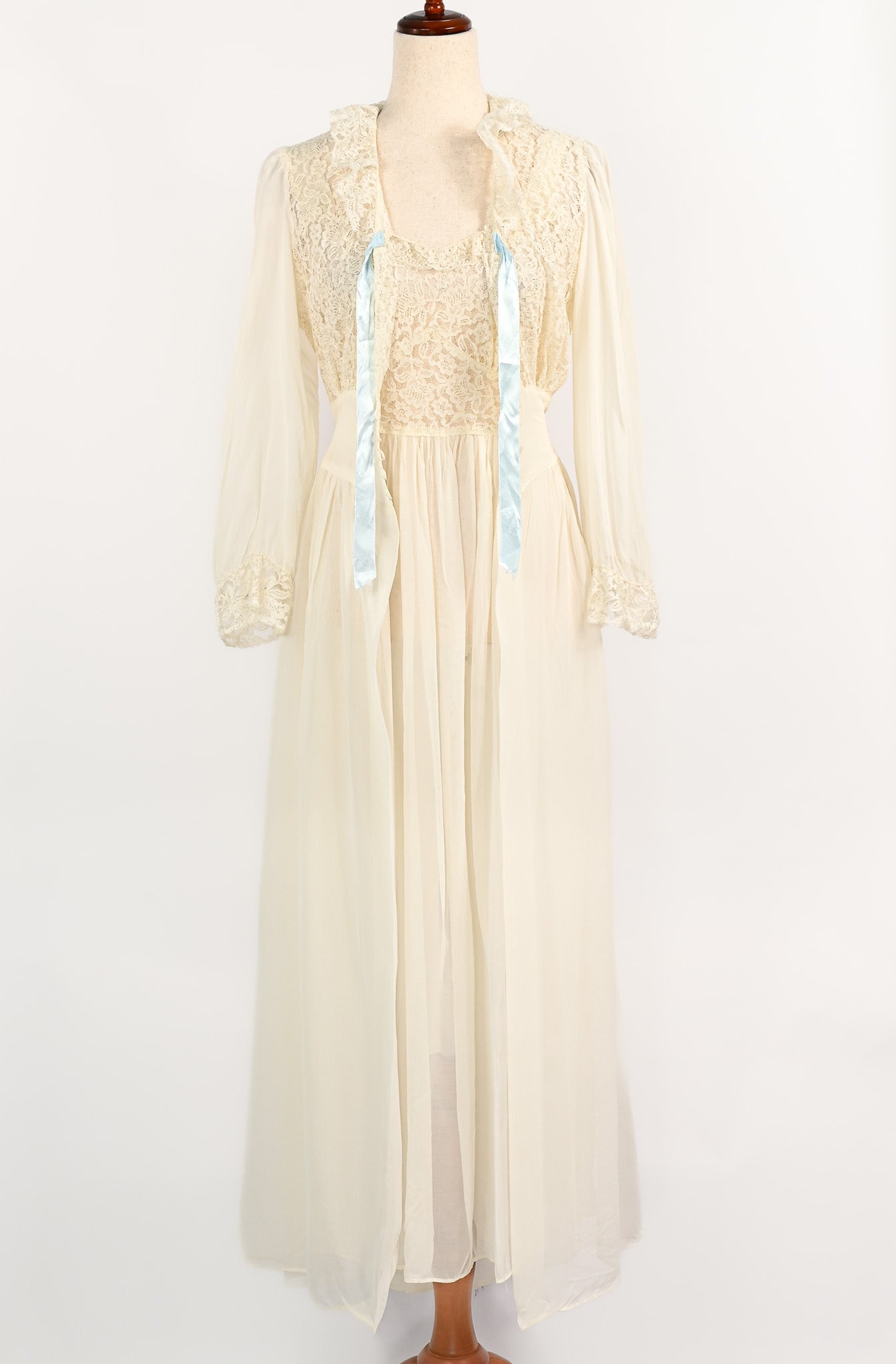 Vintage 1940s Ivory Sheer Nylon & Lace Peignoir Nightgown and Robe Set - Beautifully preserved to create your vintage nightgown dream. This darling little nightgown features a sheer lace bust area sewn down into a flowy maxi style sheer nylon skirt. For added detailing, the nightie features a matching robe overlay that has additional sheer lace on the bust area and sleeve hems, a 5 button bias cut waistline, sewn down into another flowy sheer nylon maxi skirt, and to add a pop of color, a baby blue ribbon.