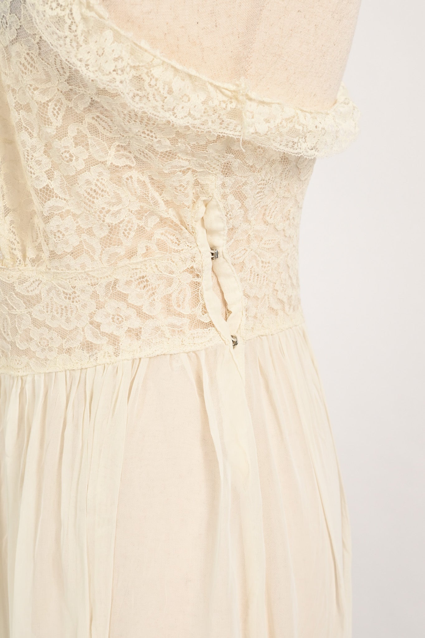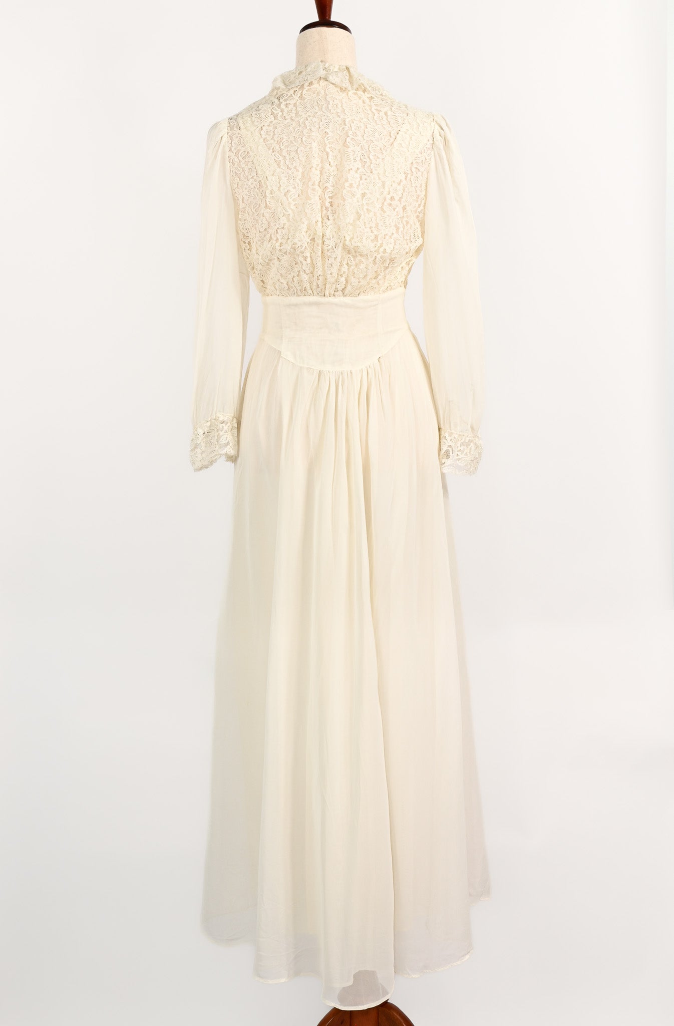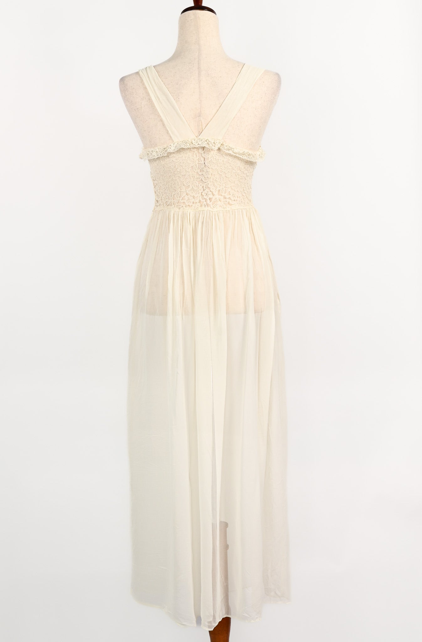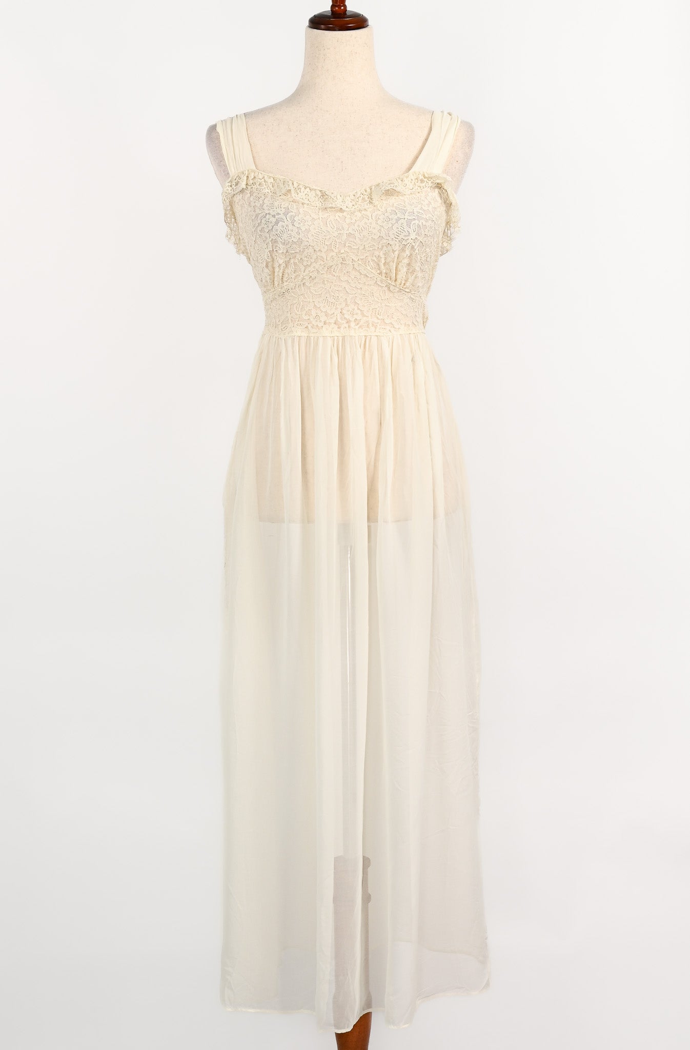 Vintage 1940s Ivory Sheer Nylon & Lace Peignoir Nightgown and Robe Set - Beautifully preserved to create your vintage nightgown dream. This darling little nightgown features a sheer lace bust area sewn down into a flowy maxi style sheer nylon skirt. For added detailing, the nightie features a matching robe overlay that has additional sheer lace on the bust area and sleeve hems, a 5 button bias cut waistline, sewn down into another flowy sheer nylon maxi skirt, and to add a pop of color, a baby blue ribbon.