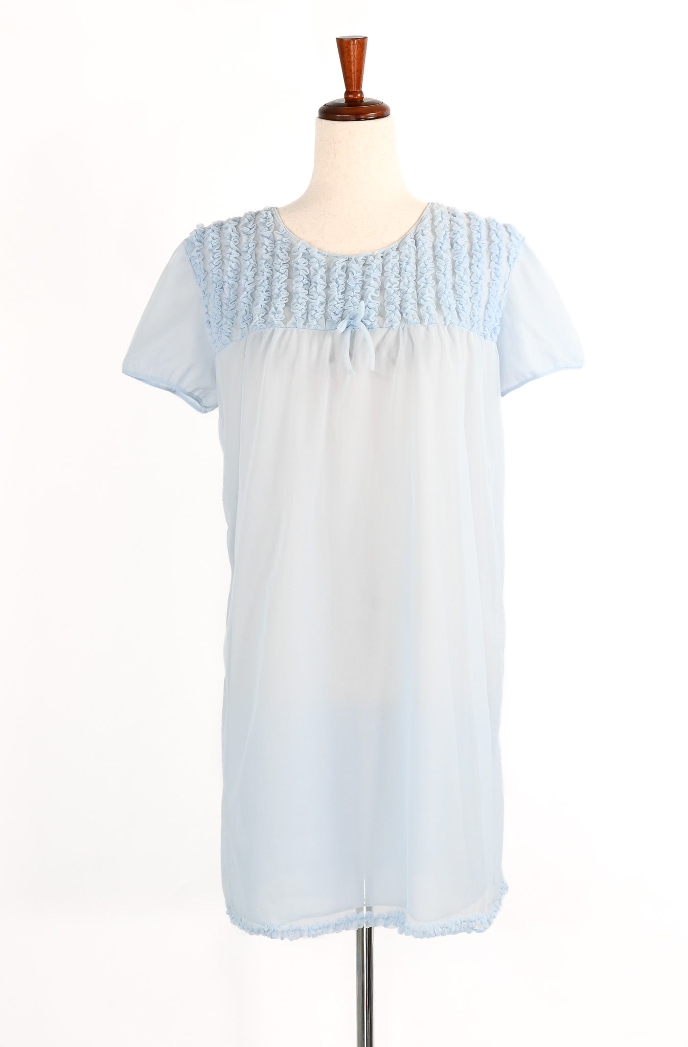 Vintage 50s/60s Light Blue Nylon RICAM Ruffle Nightgown - An elegant nightgown for a good night's sleep. This nightgown features a ruffle design at the top of the gown as well as on the bottom trim, and top top it all off , a little bow near the top of the gown.