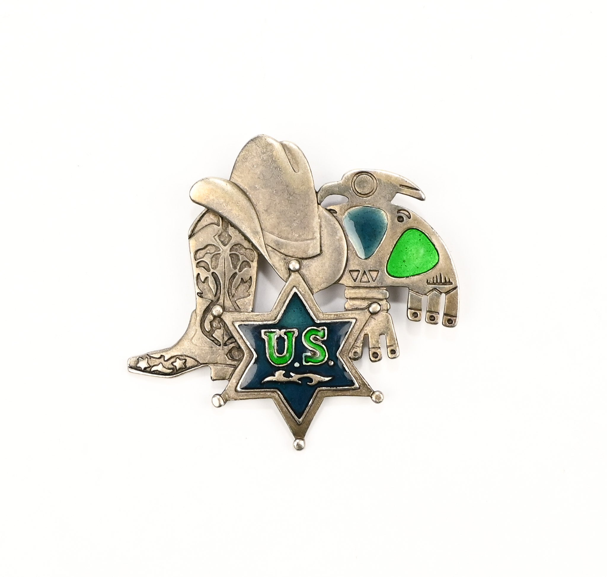Vintage Metal Western U.S. Brooch Pin - A metal brooch that features a cowboy boot, cowboy hat, and thunderbird.