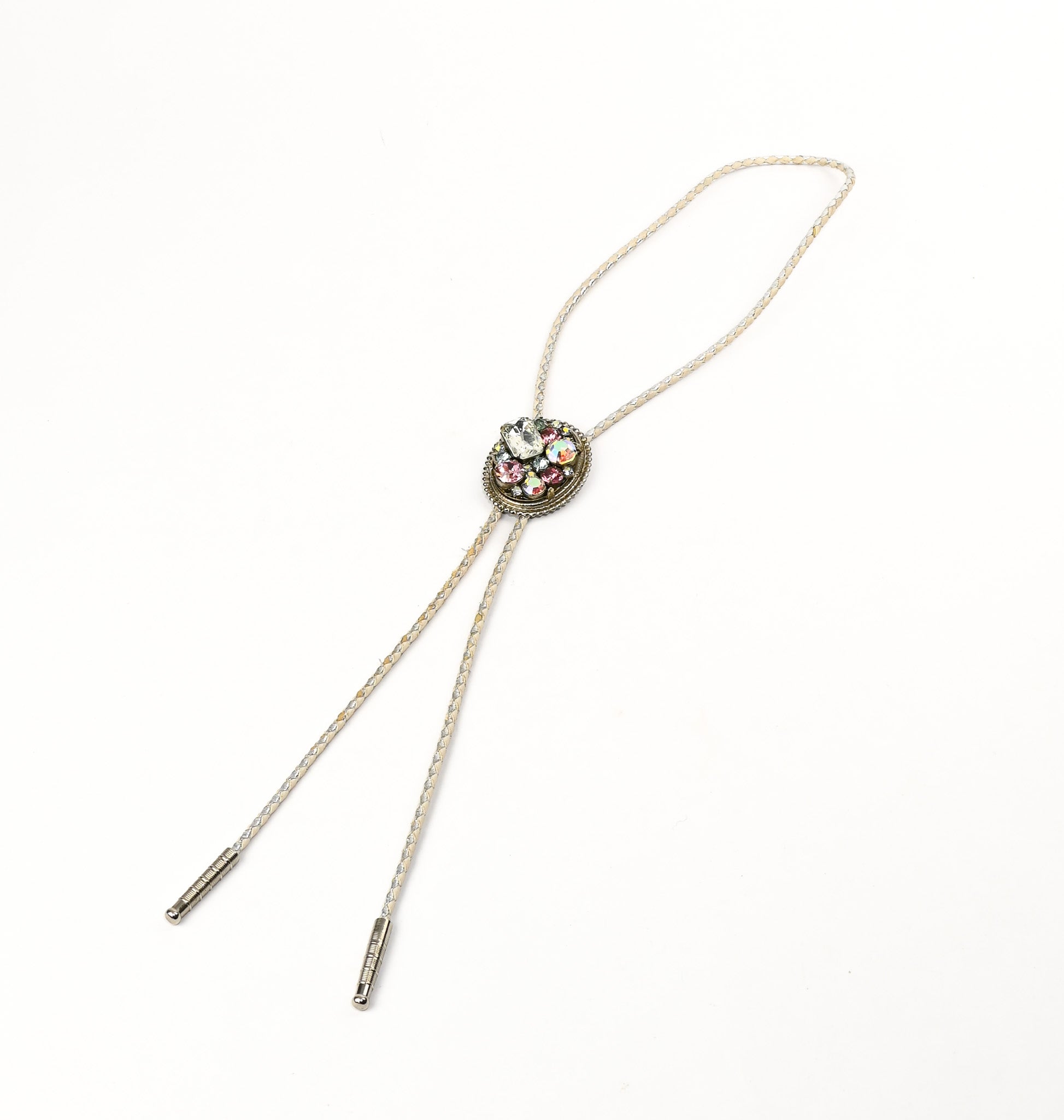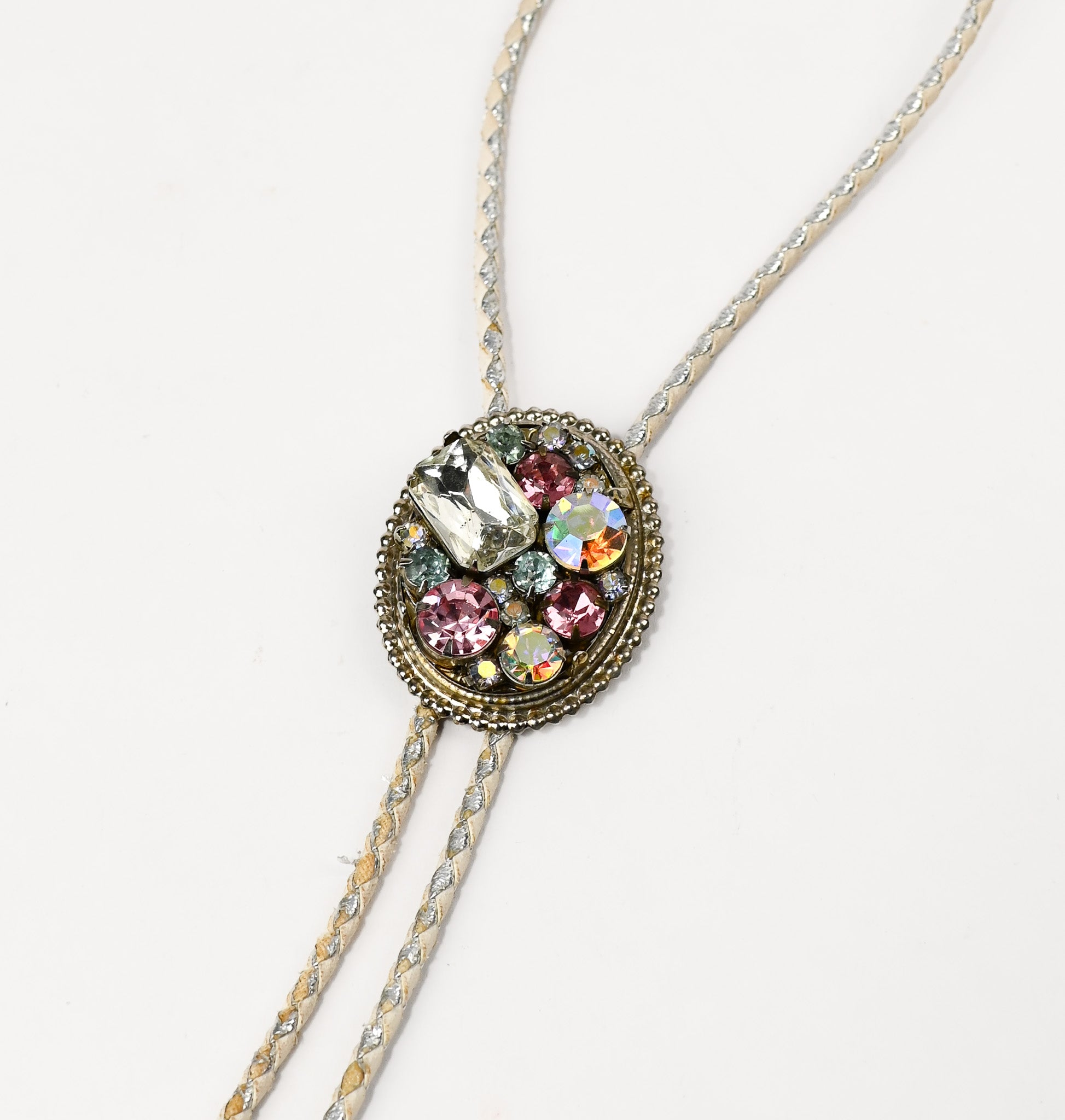 Vintage Blue, Pink & White Rhinestone Native American Western Bolo Tie - This bolo tie features a rhinestone design, with metal detailing around the stones, put on a white and silver woven leather tie with embossed metal tips.