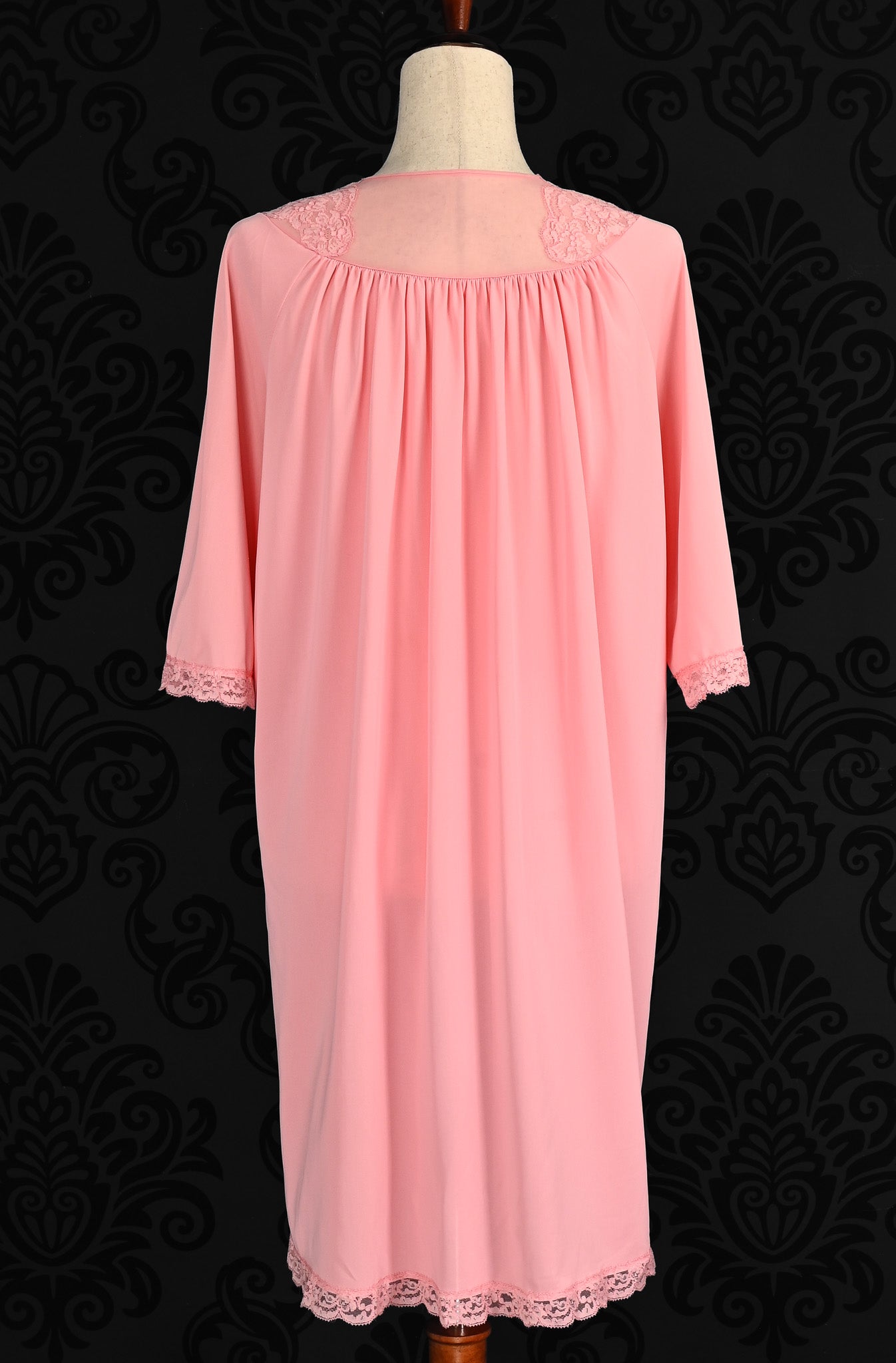 Vintage 80s Pink SHADOWLINE Embroidered Rose Button Nightgown - Truly beautiful and flowy. A nightie that can be considered a nightgown or a housecoat. This housecoat features embroidered rose on the neckline, a right side pocket, and lace on the neckline, sleeve cuffs, and hem.