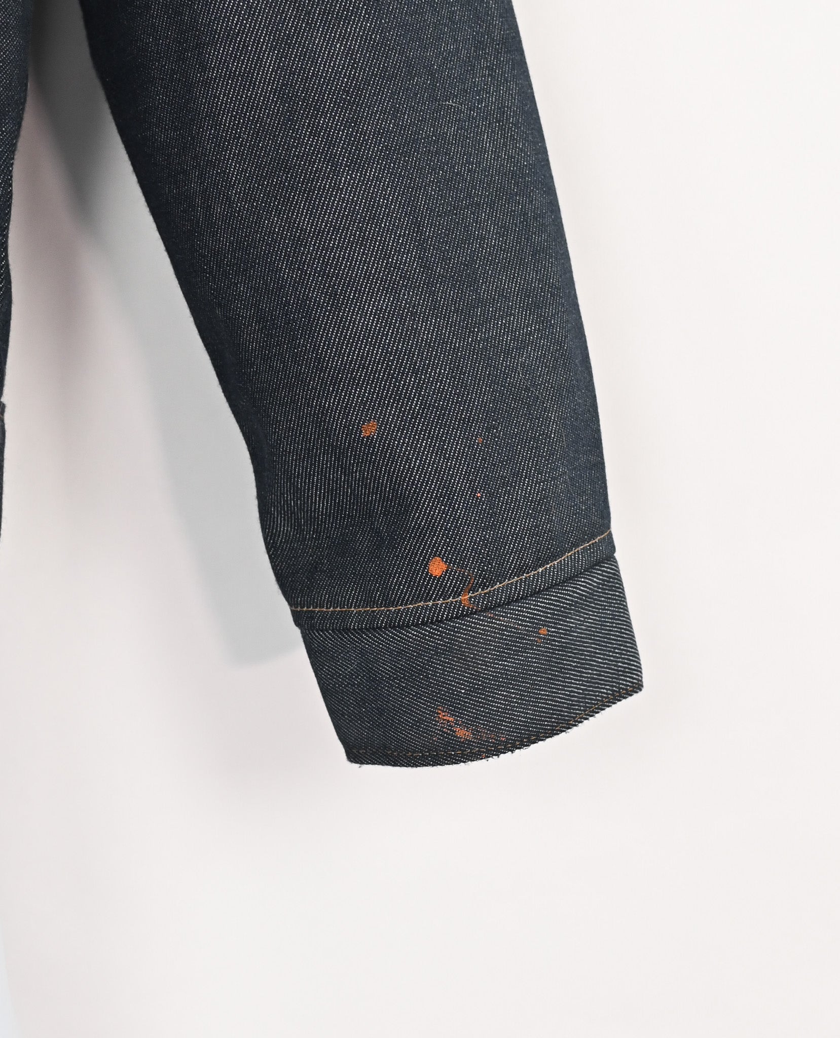 There are signs of wear due to age, use, and storage; such as orange discoloration spots on the front of the jacket.