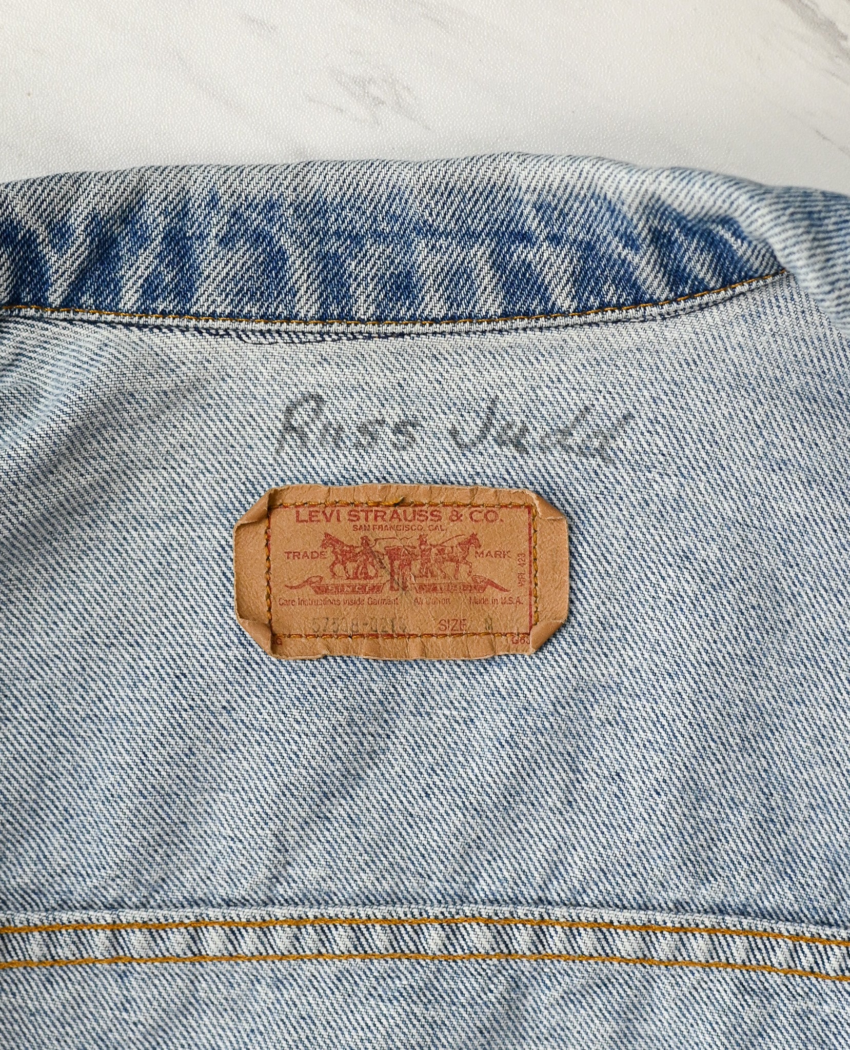 There is a small distress mark on the back of the jacket and above the tag it reads "Russ Judd."