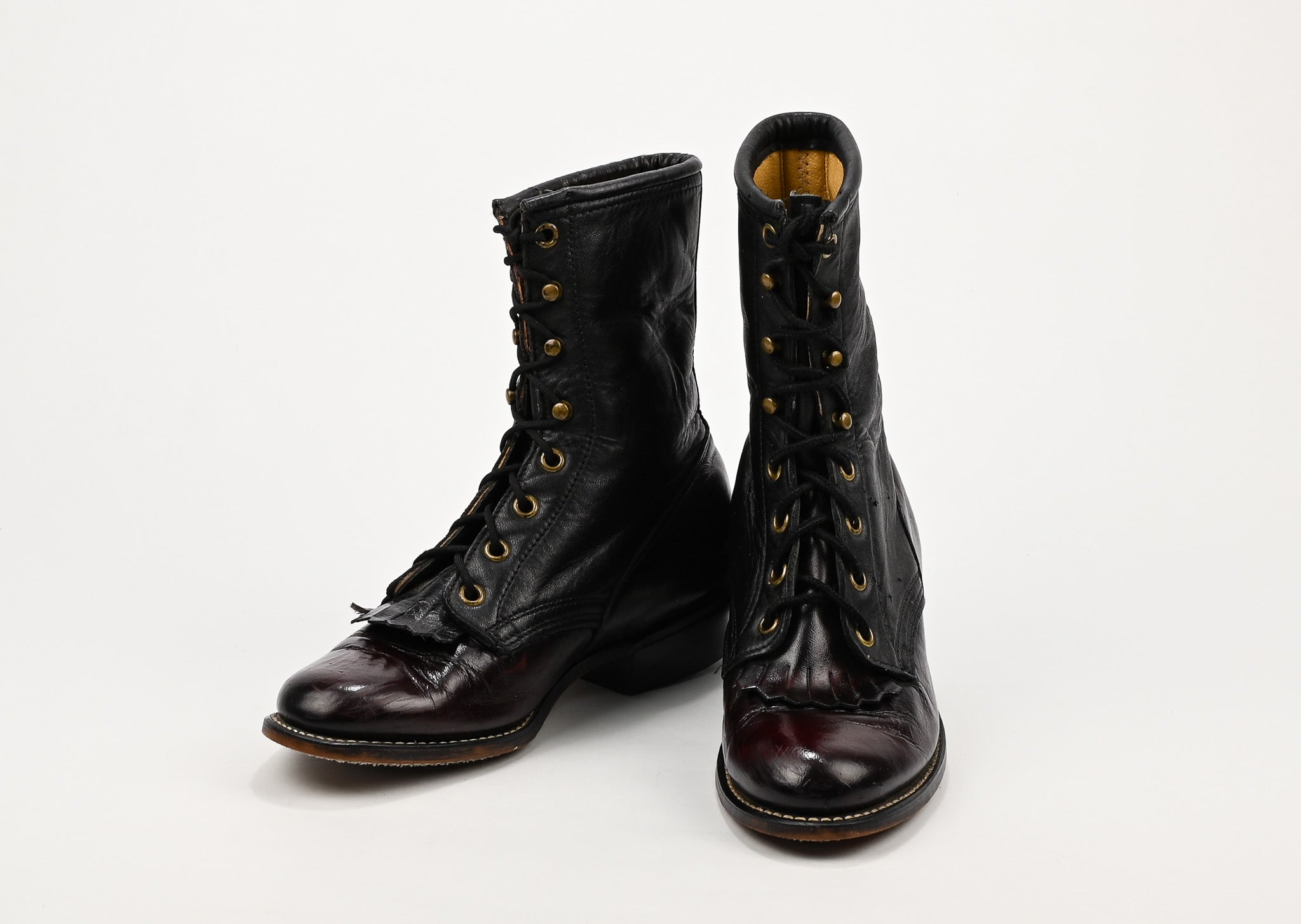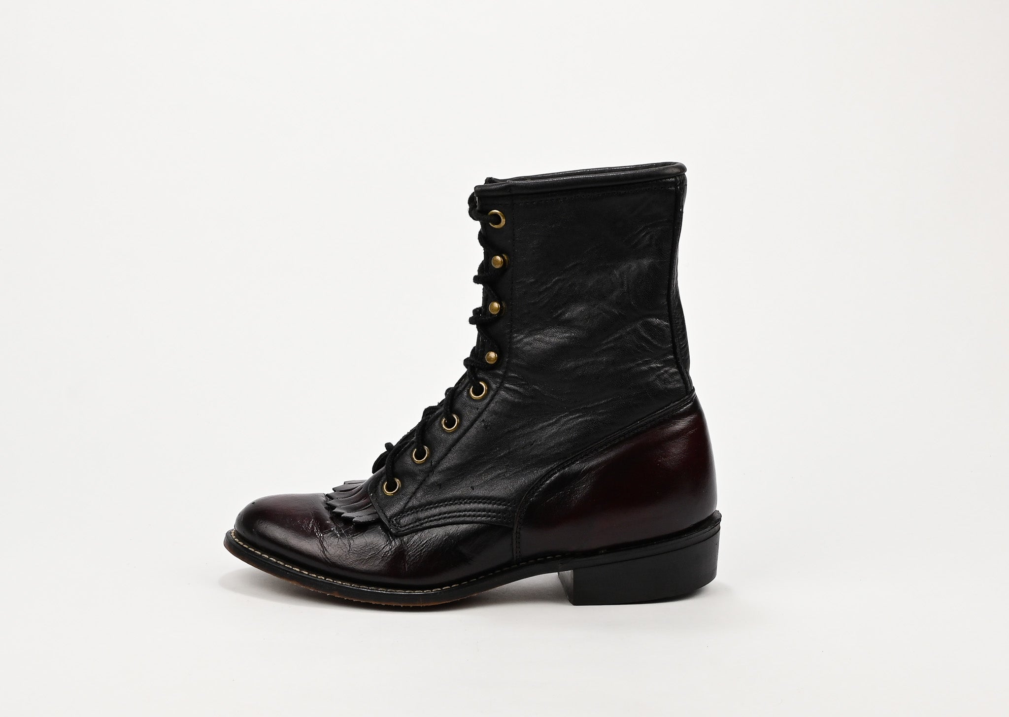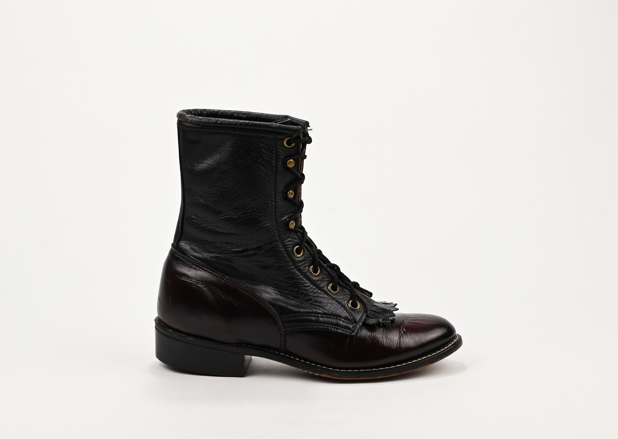 Vintage 80s/90s Black & Maroon Leather LAREDO Kiltie Lace Up Prairie Roper Boots