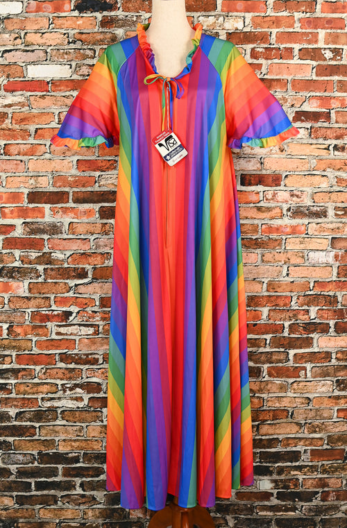 DEADSTOCK - Vintage 70s Rainbow Striped TIGER LILY Polyester Short Sleeve House Dress - One Size Fits All
