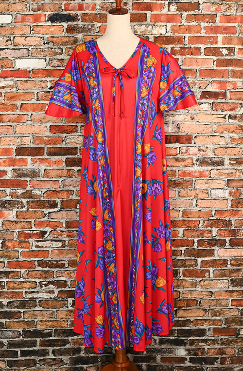 DEADSTOCK - Vintage 70s Red & Purple Floral TIGER LILY Polyester Short Sleeve House Dress - One Size Fits All
