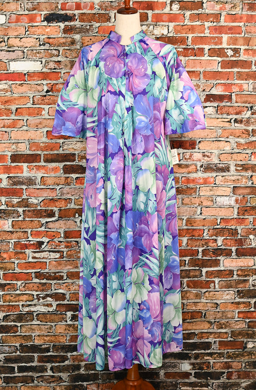 DEADSTOCK - Vintage 70s Blue & Purple Floral PYKETTES Polyester Short Sleeve House Dress - One Size