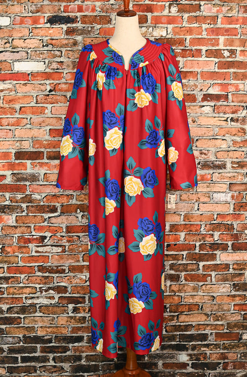 DEADSTOCK - Vintage 70s Red Floral Polyester GRANADA Zip Up House Dress - L