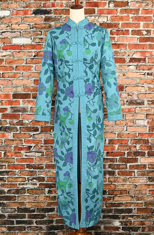 Vintage 60s Blue Floral CHARLES & CO. Chinese Style House Dress Coat - L