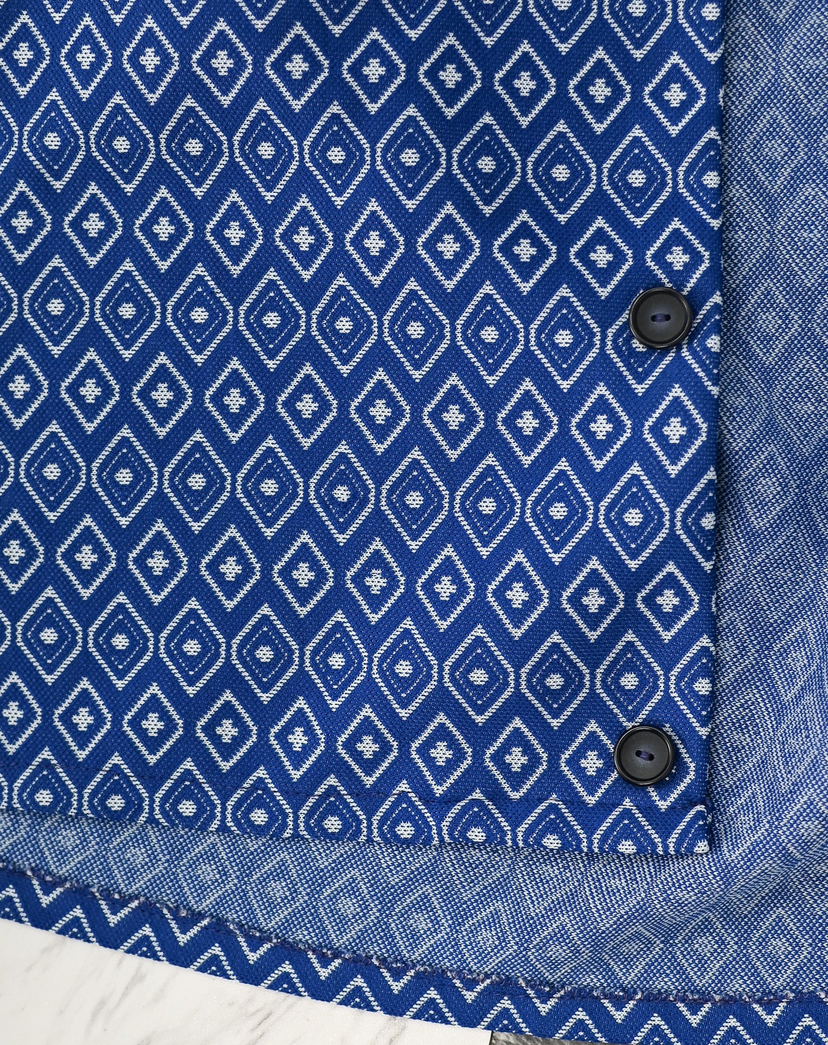 この青い幾何学的なボタンのシャツは 素晴らしい 状態。