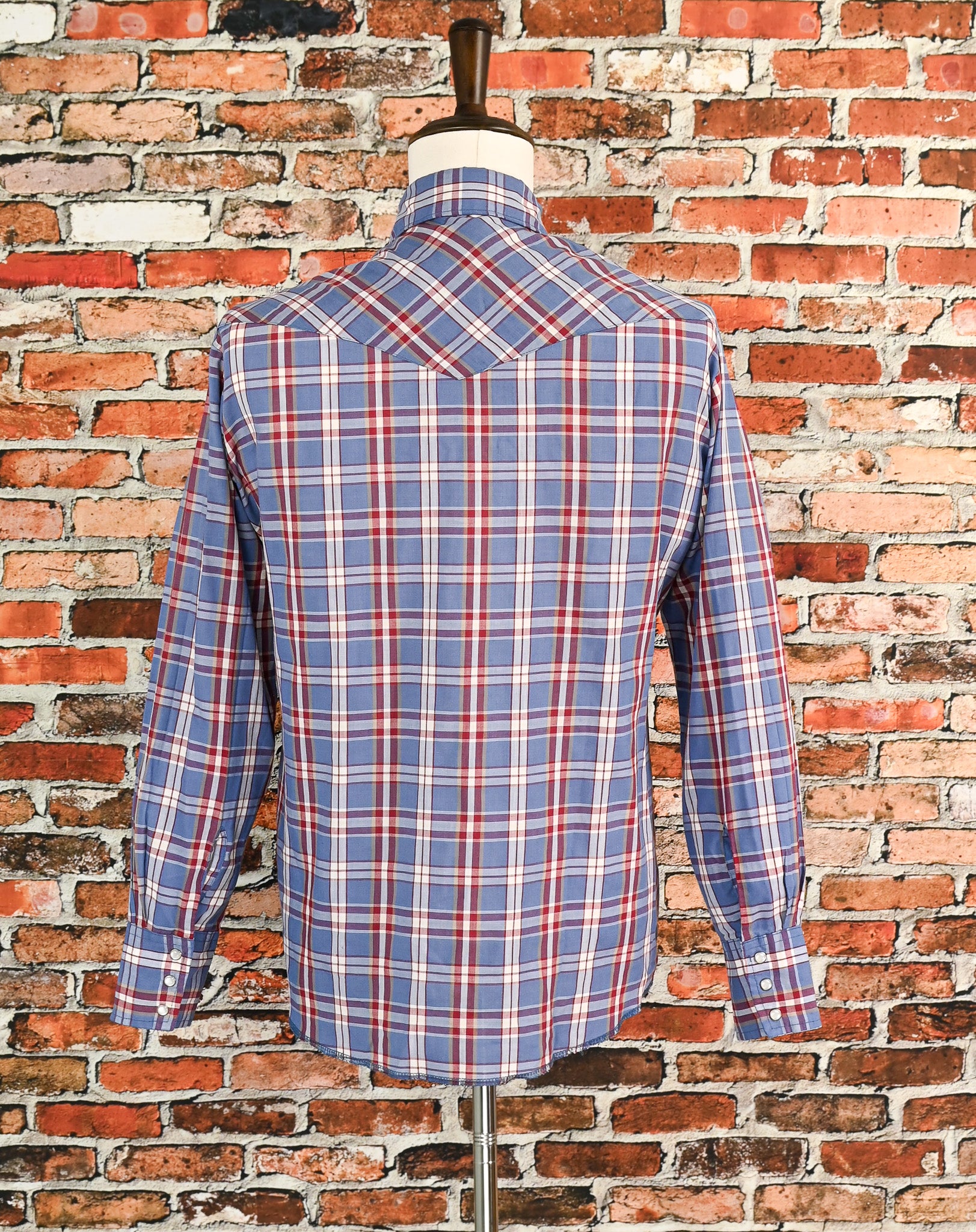 メンズヴィンテージラストラーブルー&レッドチェック柄パールスナップボタンロングスリーブシャツ