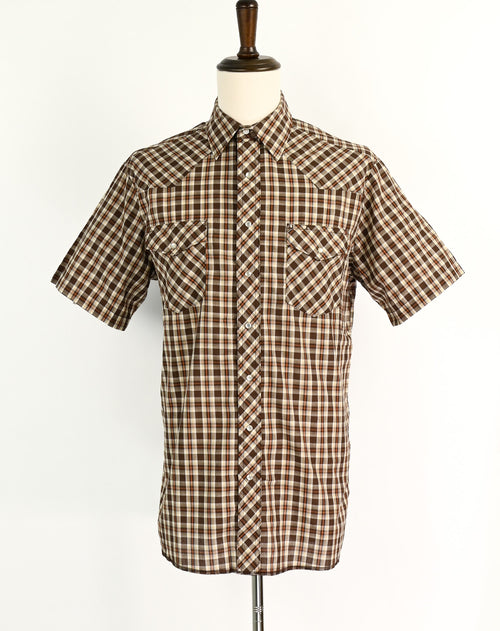 メンズ ヴィンテージ ラングラー ブラウン チェック柄 半袖 スナップボタン ウエスタン シャツ - LT/GA/GL