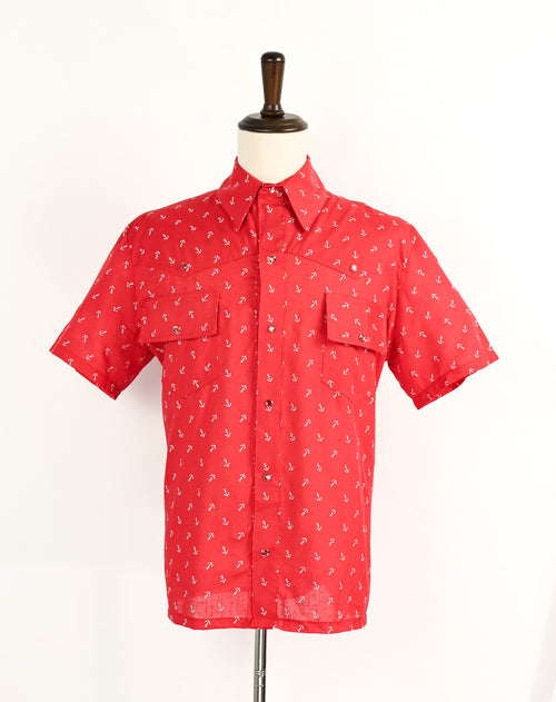 メンズ ロカビリー レッド アンカー プリント 半袖 スナップ ボタン ウエスタン シャツ