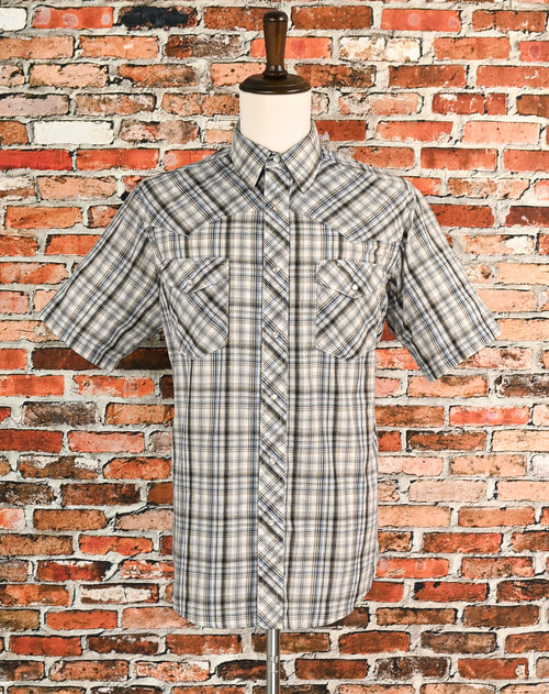Vintage 80s Blue & Grey Plaid WRANGLER Short Sleeve Snap Button Western Shirt