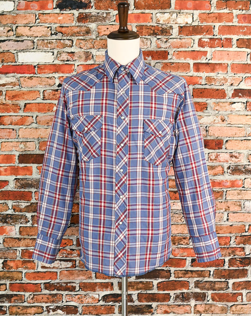 メンズヴィンテージラストラーブルー&レッドチェック柄パールスナップボタンロングスリーブシャツ