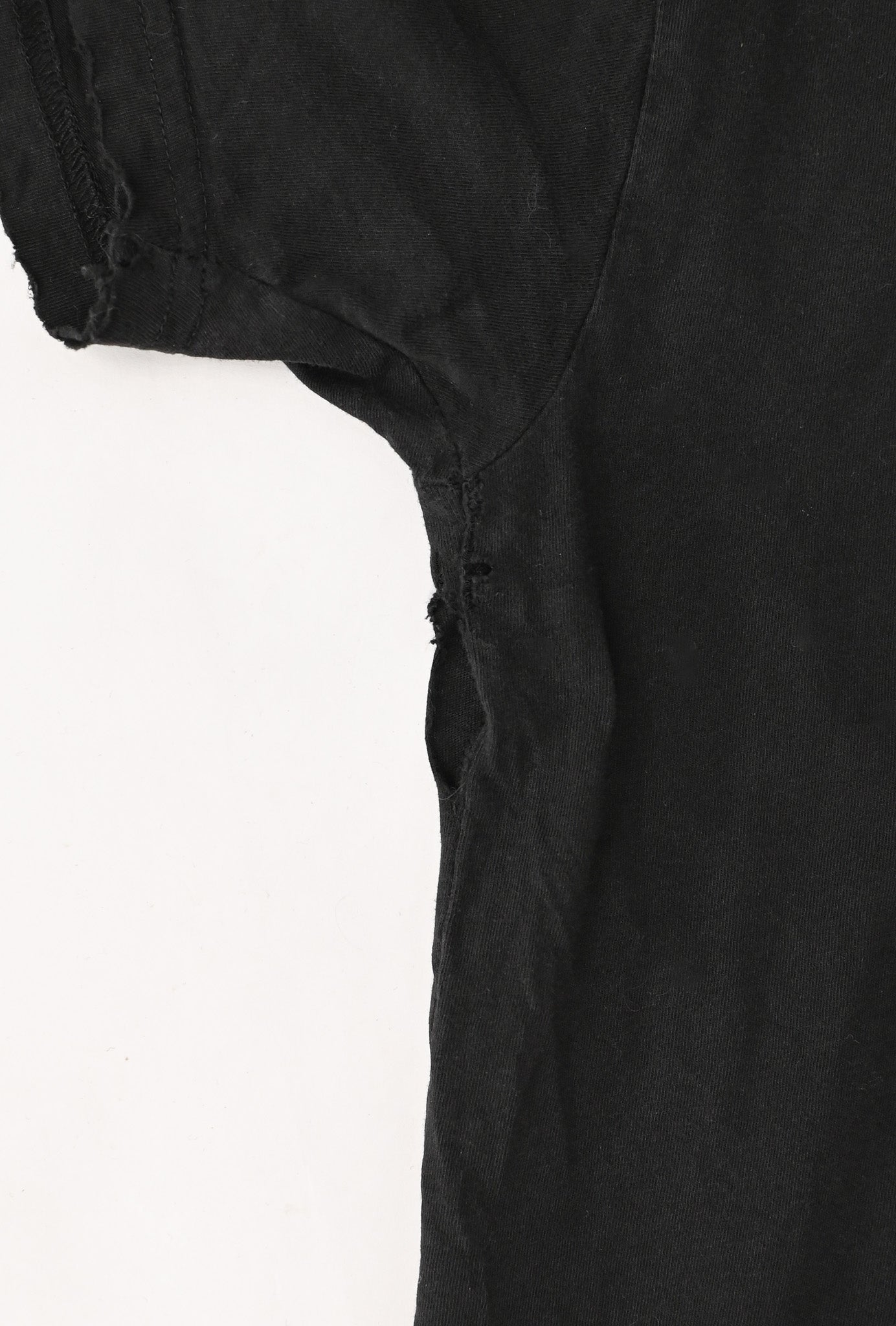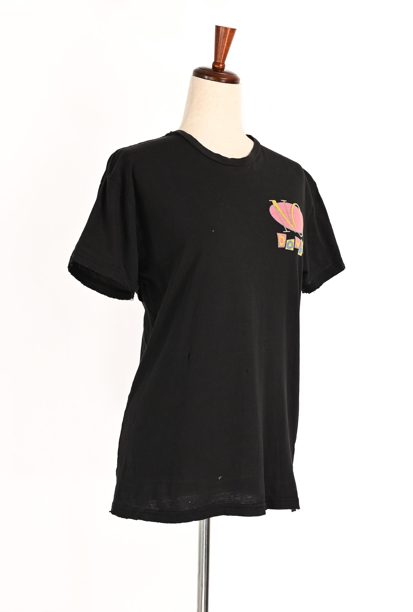 There are signs of wear due to age, use, and storage; such as holes in both armpits; distress to the sleeve hems, collar, and bottom hem; four holes to the front, ten holes to the back, and fading to the printing.