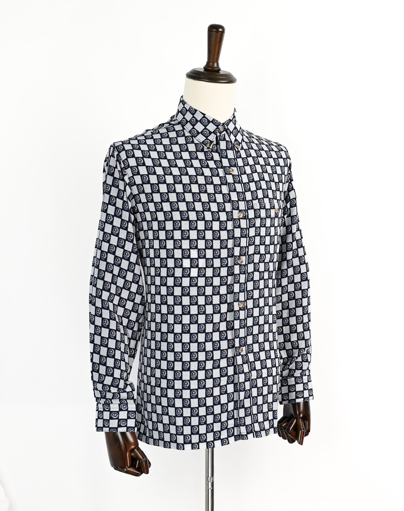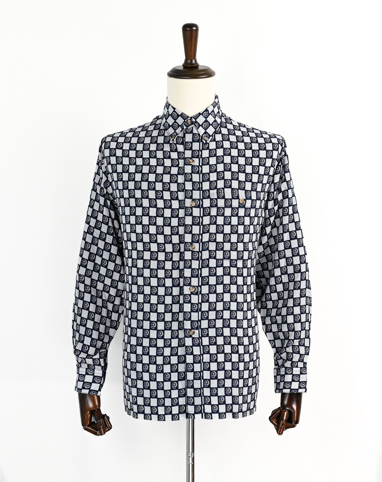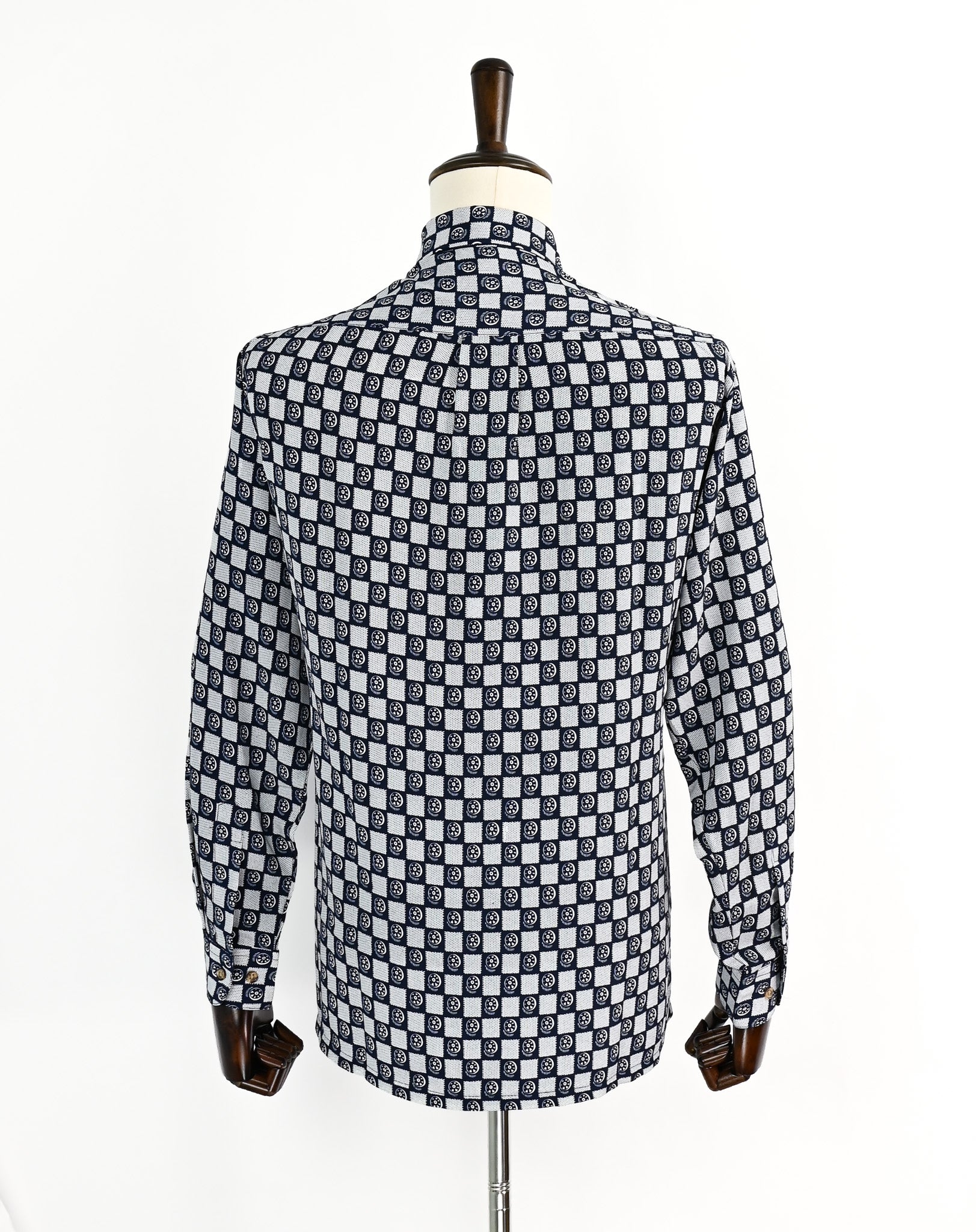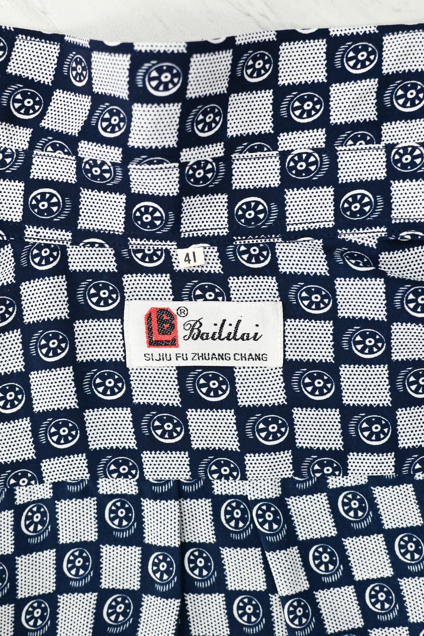 Bailiai Sijiu Fu Zhuang Chang 長袖ボタン ダウン シャツ- この種類の濃い青と白の市松模様の幾何学的なシャツは、何マイルにもわたるスタイルを持っています。
